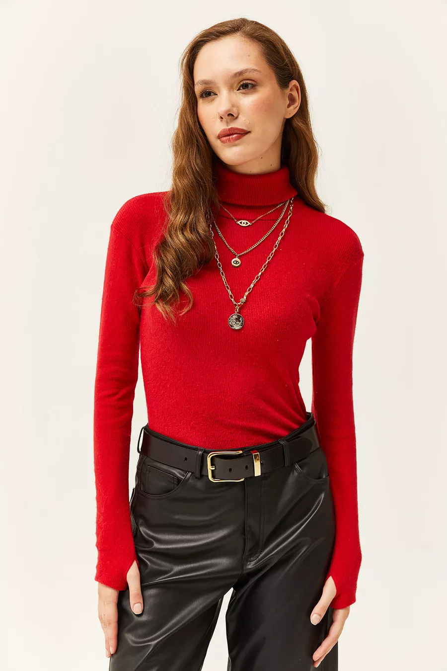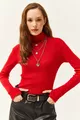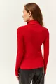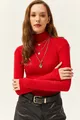 Blusa da donna rossa con collo alto a coste e dettaglio sulle dita in lycra