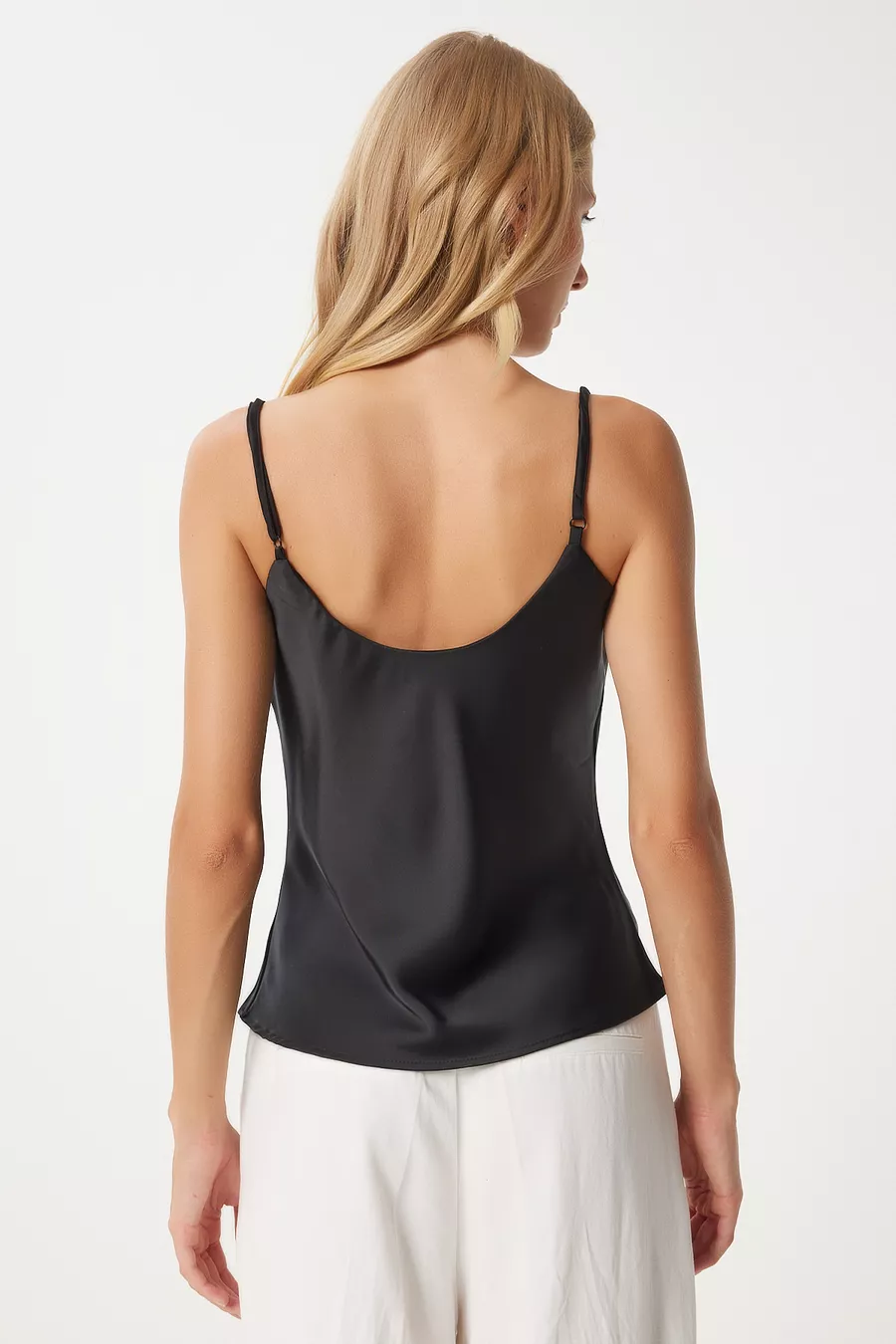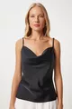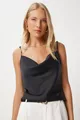 Blusa Donna in Tessuto con Scollo a V e Finitura in Raso Nero
