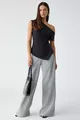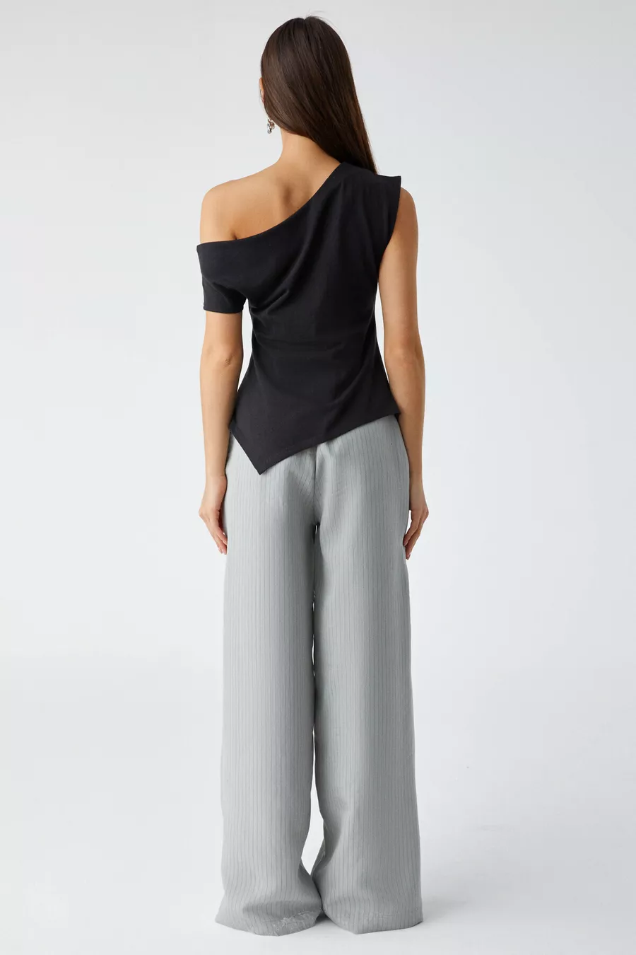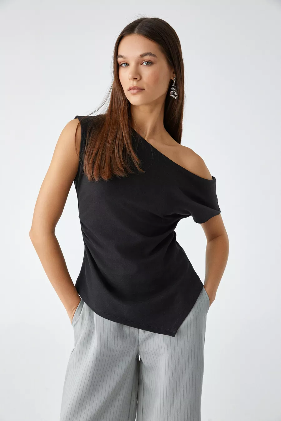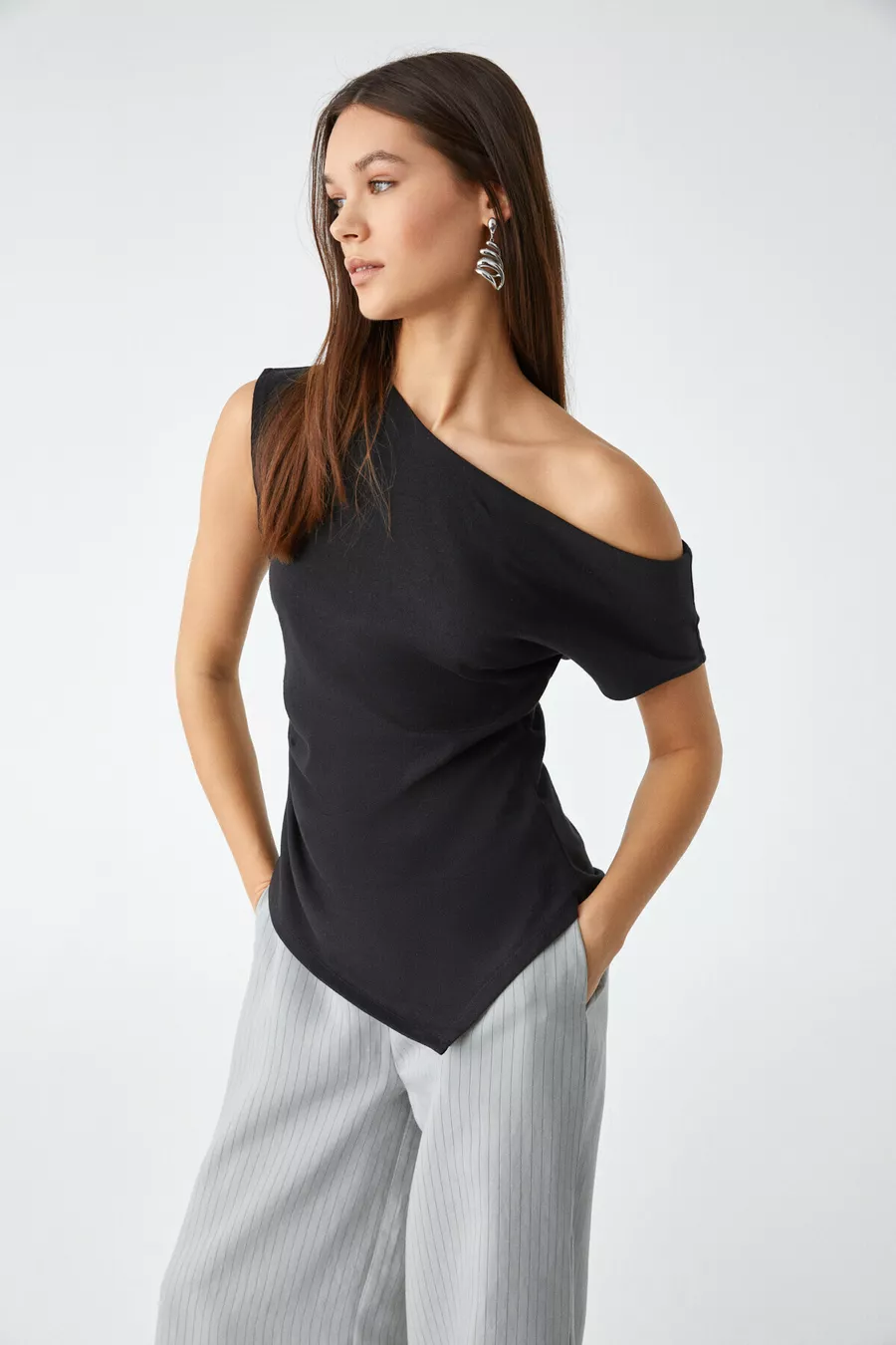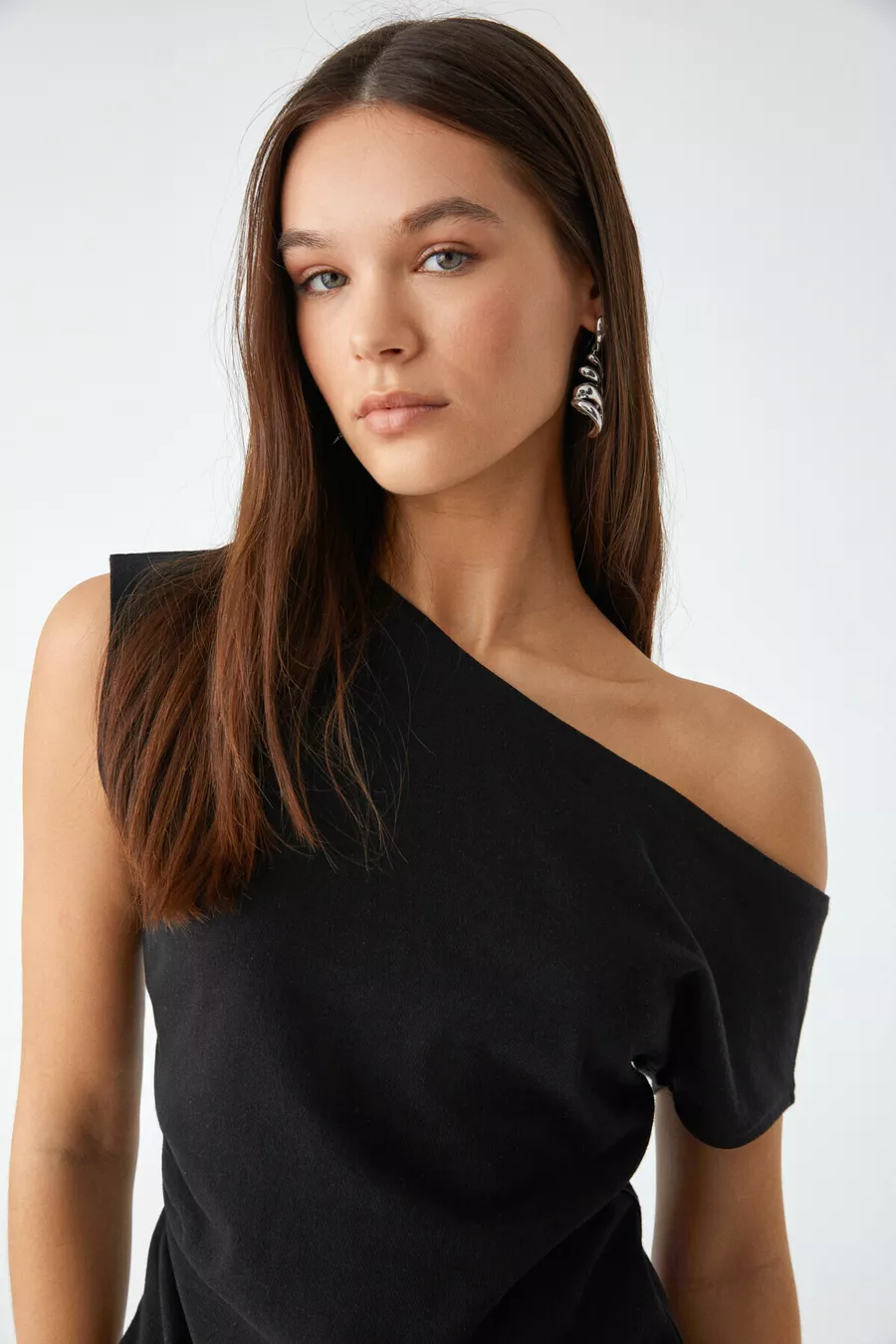 Blusa Nera da Donna Rehınga con Collo Asimmetrico, Maniche Corte, Vestibilità Regular, % Cotone