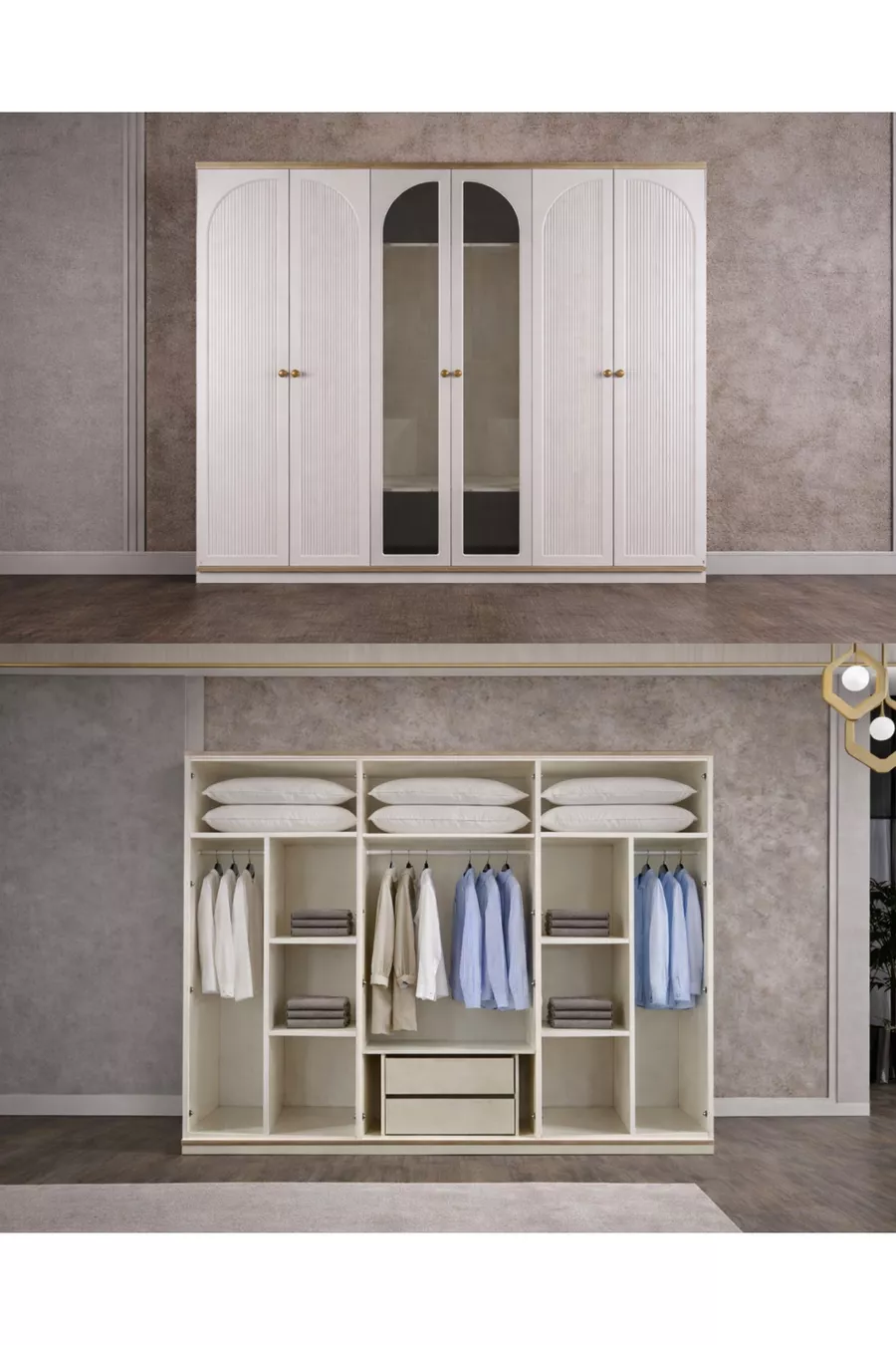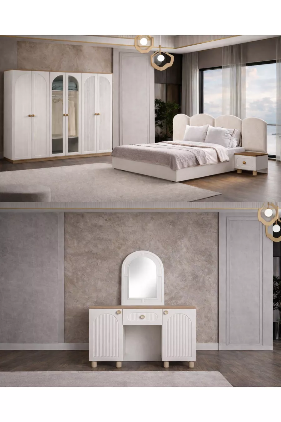 Colore: Beige Periodo di Garanzia: 2 Anni Dimensioni Letto/Struttura: 160 x 200 Funzione Letto: Con Contenitore Funzione Armadio: Con Specchio Materiale Corpo Armadio: Truciolato Laminato Numero di Ante: 6 Contenuto Set: Letto + 2 Comodini + Cassettiera + Armadio + Specchio Stile: Moderno Tema / Stile: Moderno Origine: TR