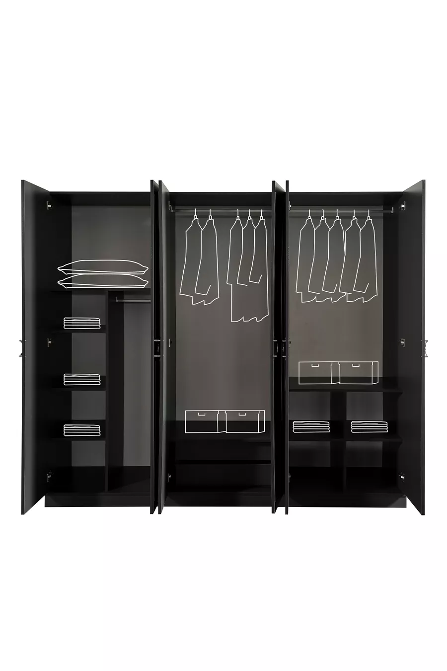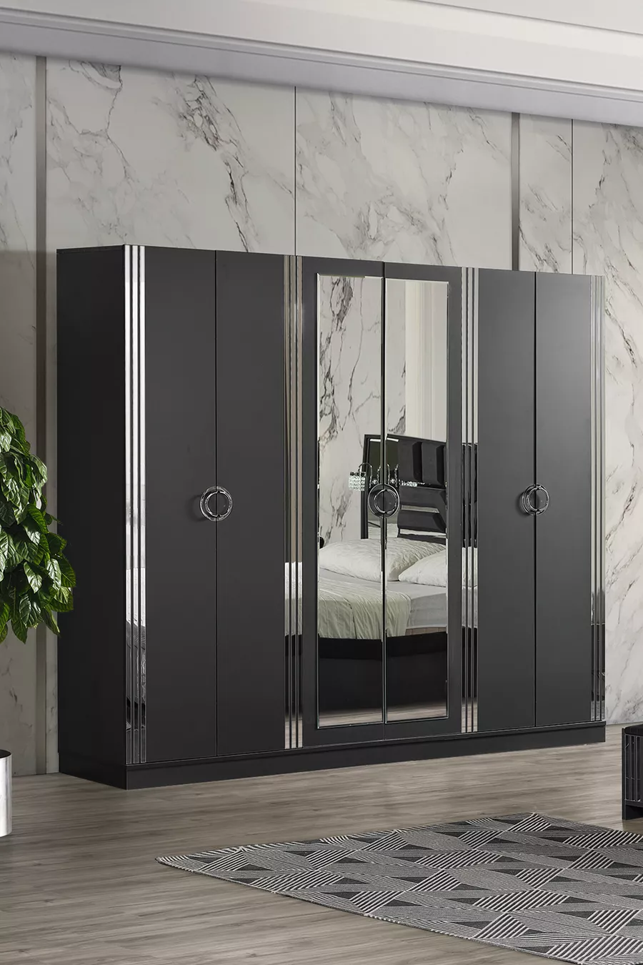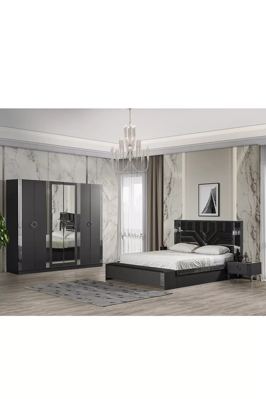 Colore: Nero Periodo di garanzia: 2 anni Dimensione letto/box: 160 x 200 Funzione letto: Con contenitore Funzione armadio: Con specchio Materiale corpo armadio: MDF Numero di ante: 6 Contenuto del set: Letto con contenitore + 2 comodini + Cassettiera + Armadio Stile: Moderno Tema/Stile: Moderno Origine: TR Caratteristica: Con specchio