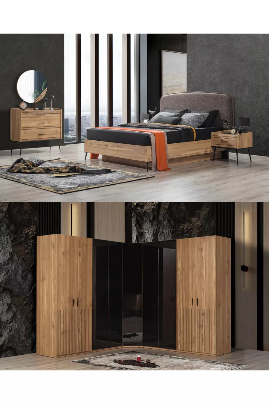 Contenuto del Set: Letto con contenitore + 2 Comodini + Cassettiera + Armadio