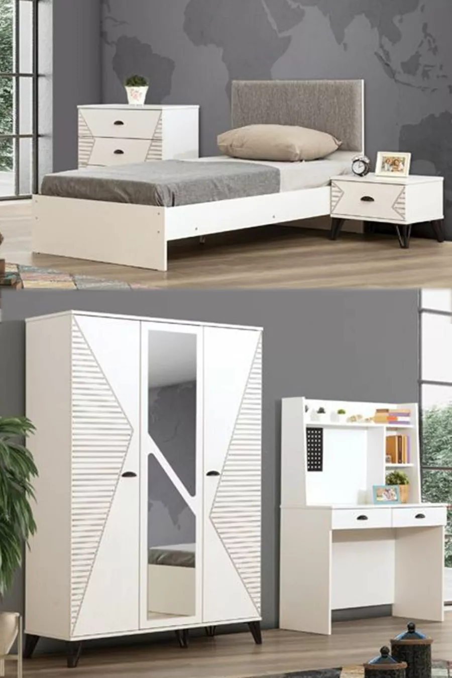 Camera da letto giovane Safir - Armadio a 3 ante, Letto, Comodino, Cassettiera, Scrivania