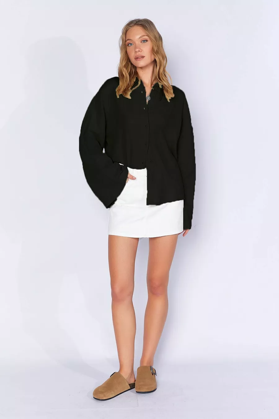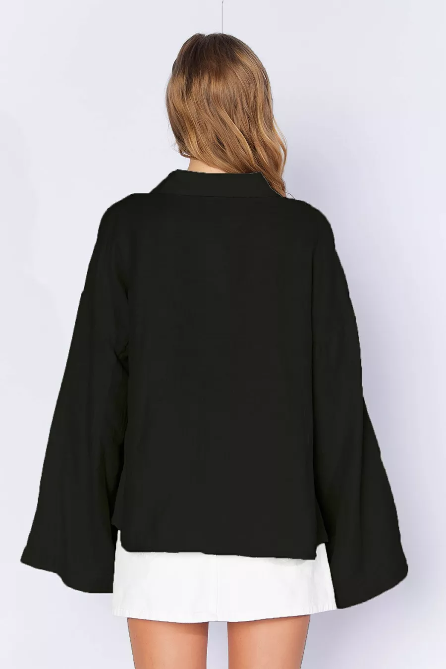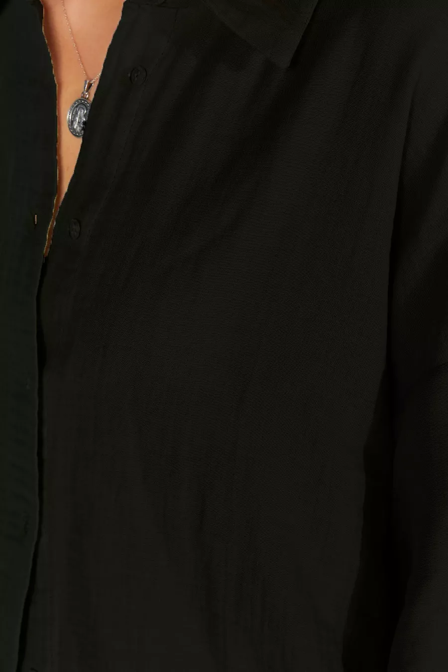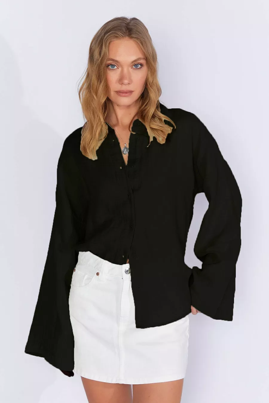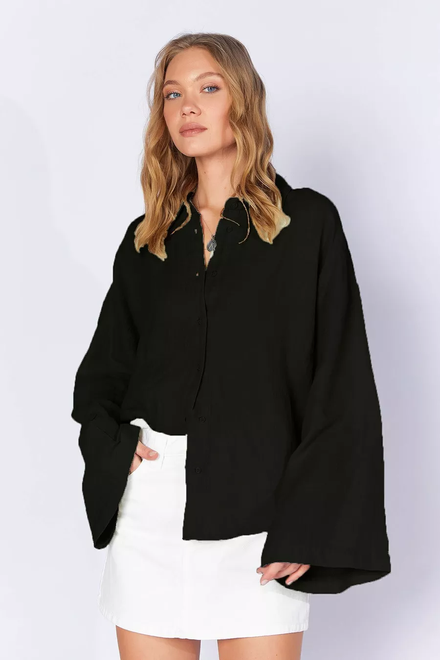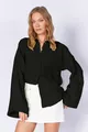 Camicia basic da donna nera a maniche lunghe, oversize, in mussola lavata morbida |