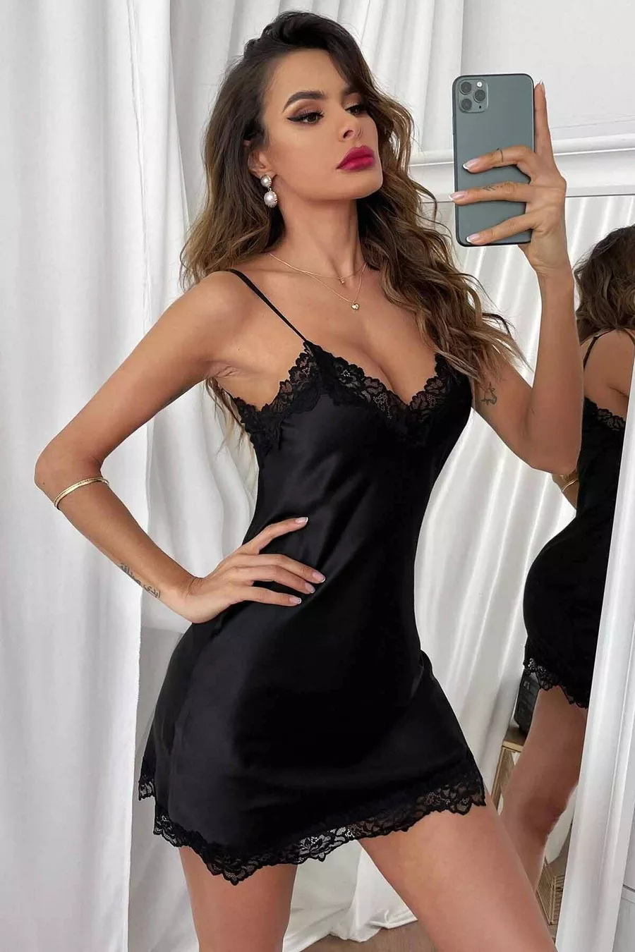 Camicia da notte elegante in satin con pizzo
