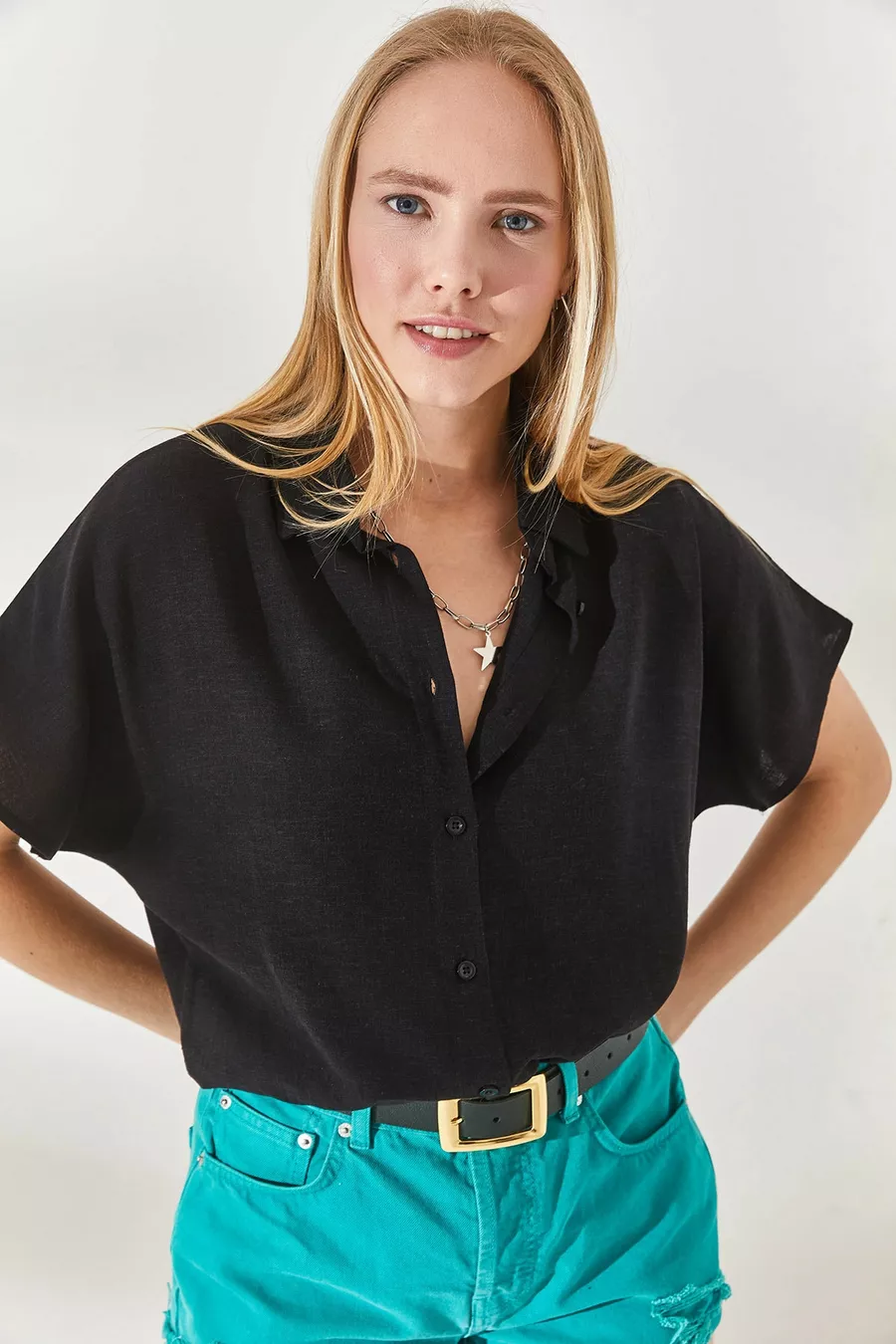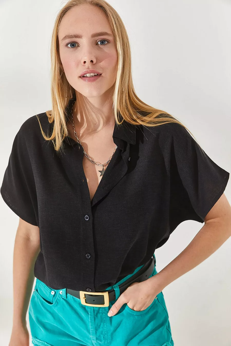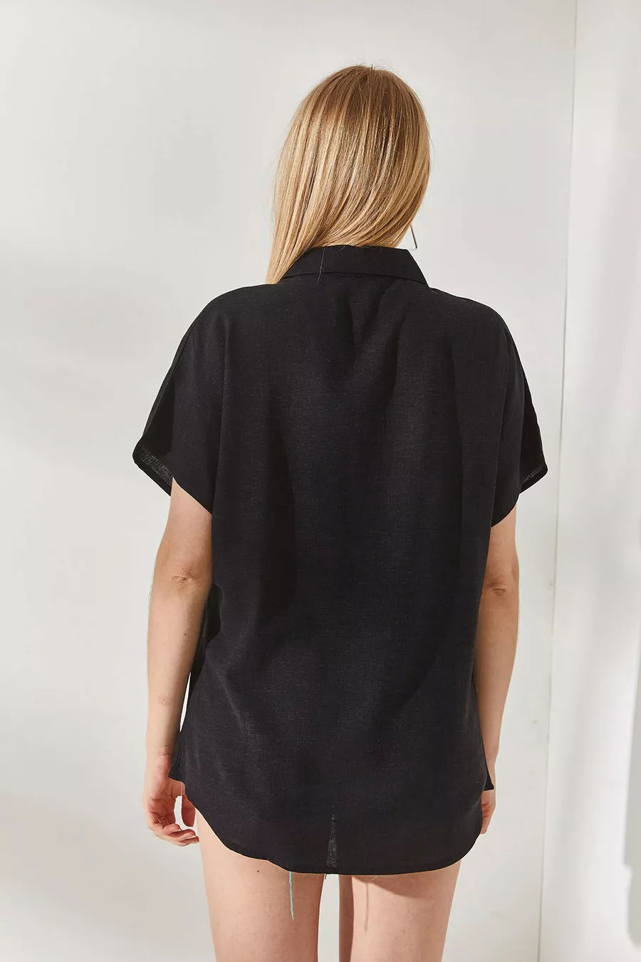 Camicia Donna Oversize in Lino Nero a Maniche a Pipistrello