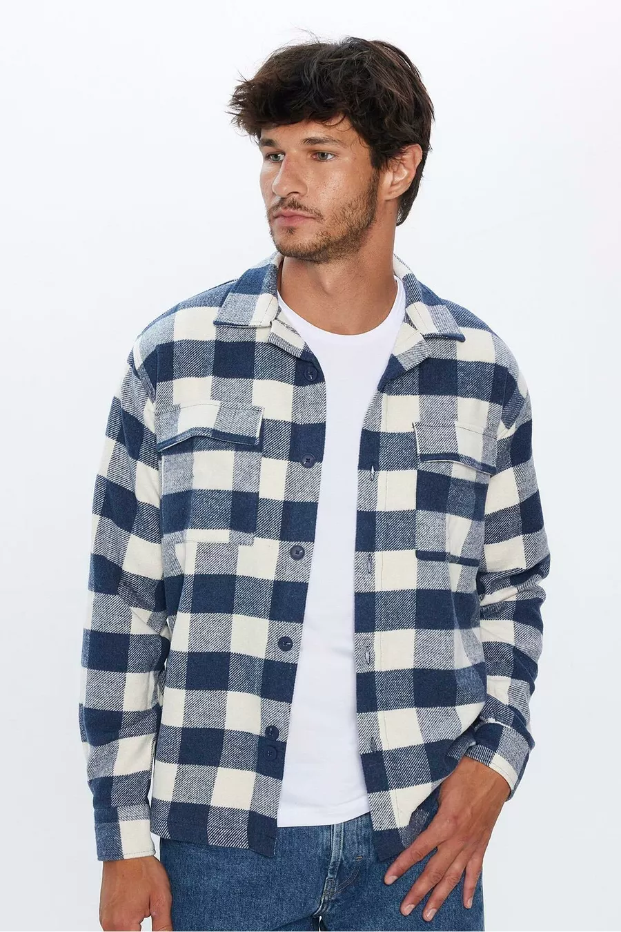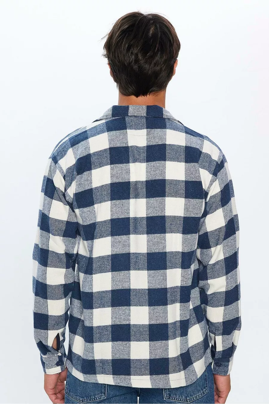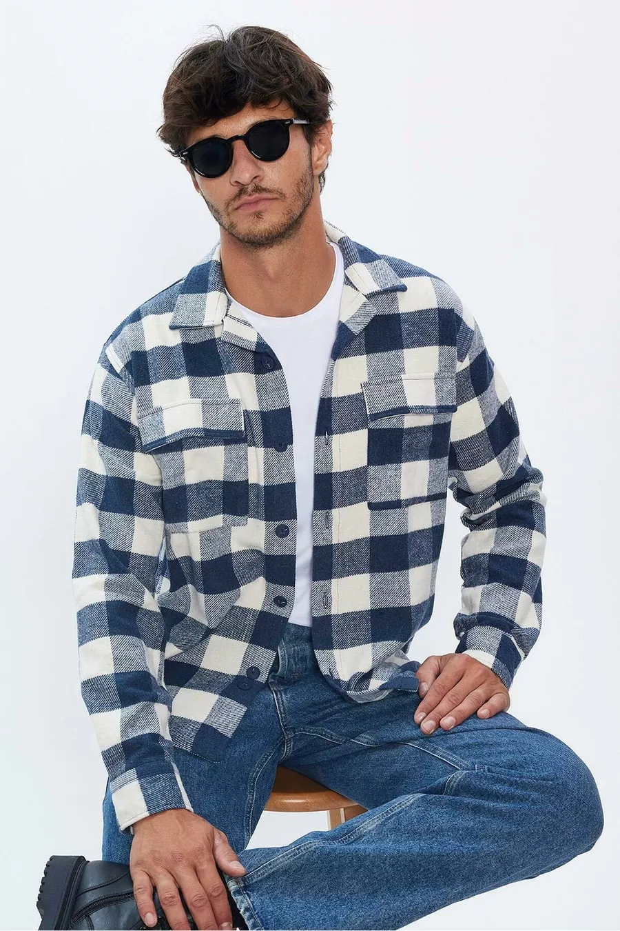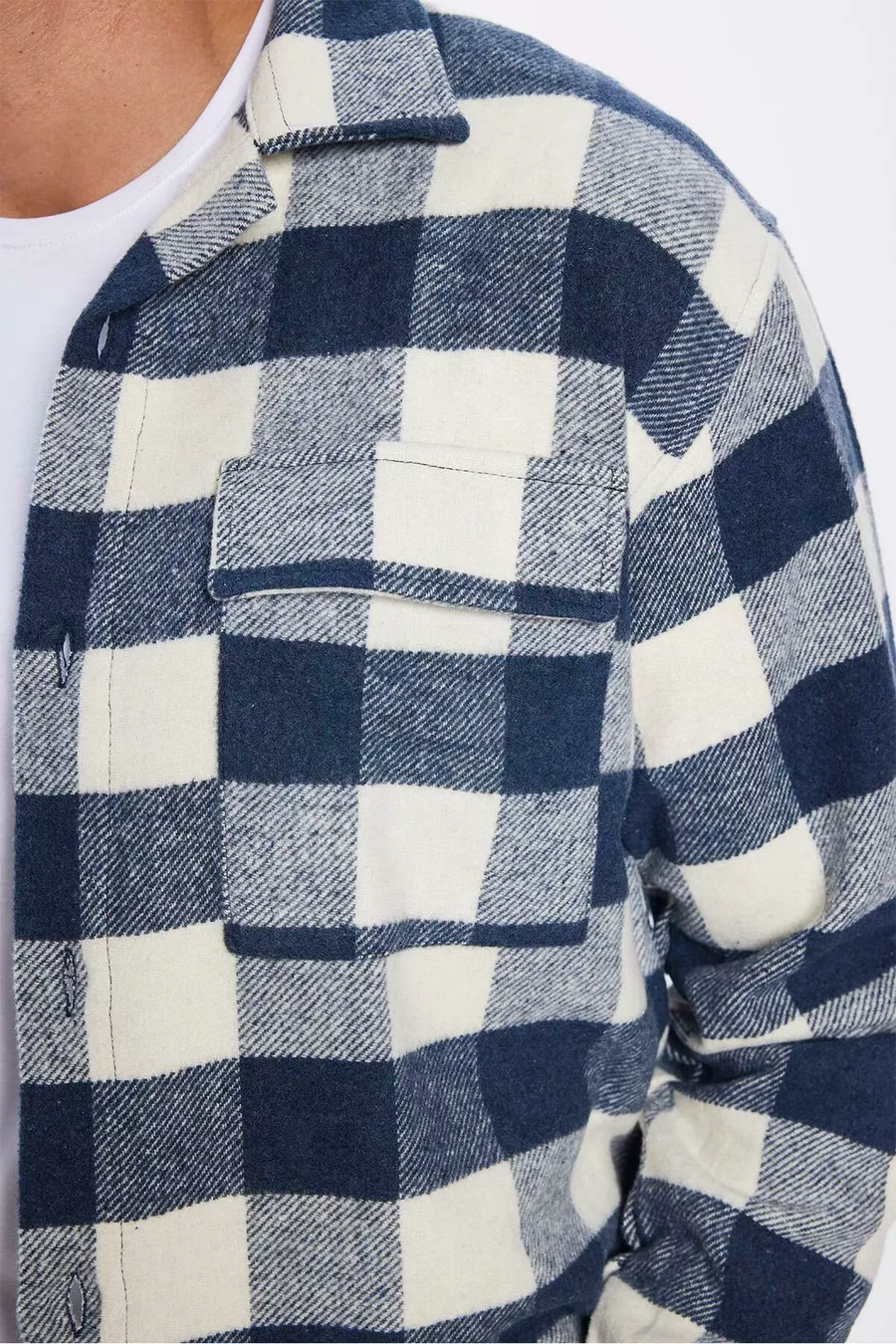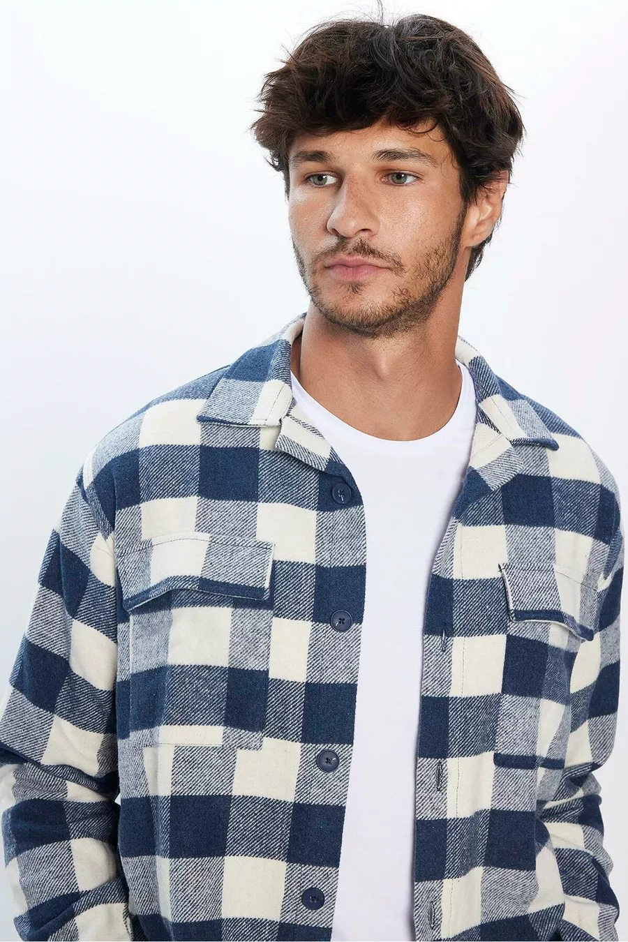 Camicia invernale da uomo a quadri, vestibilità comoda Relax Fit, collo alla coreana, con doppia tasca con pattina