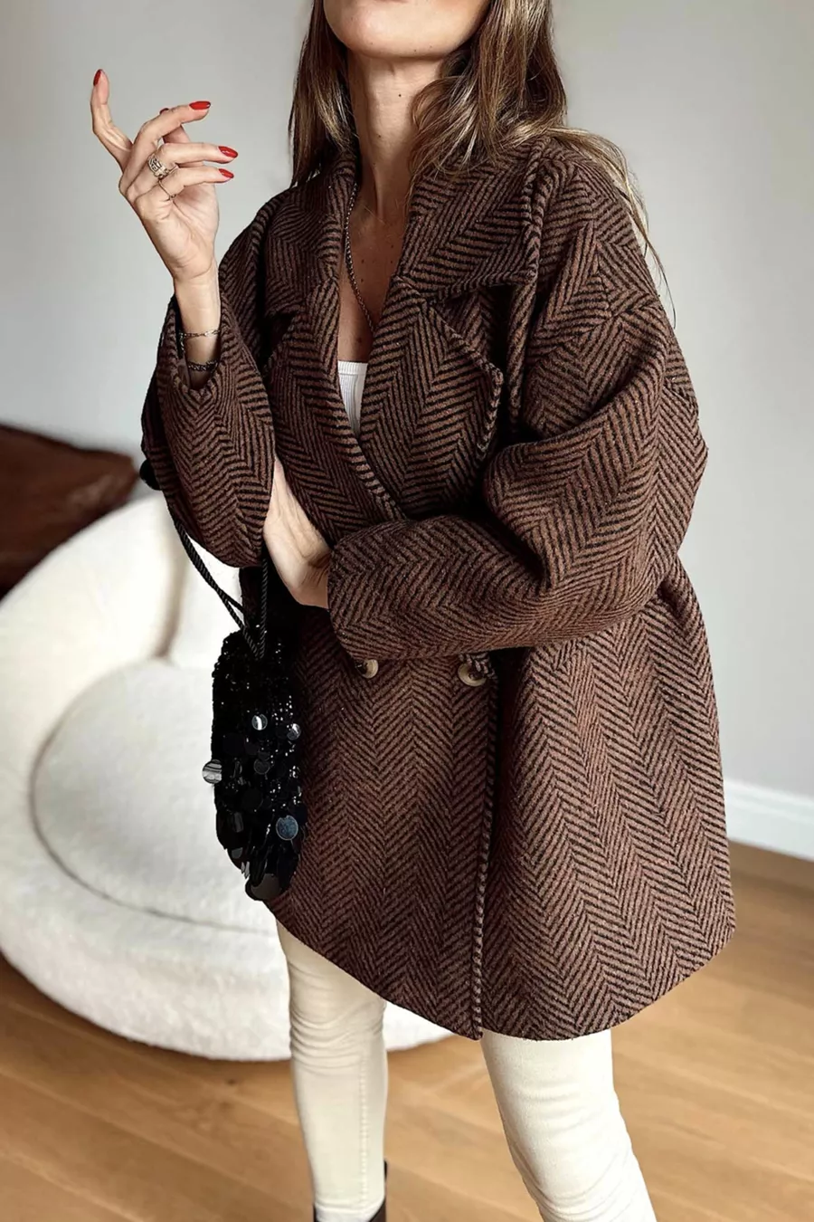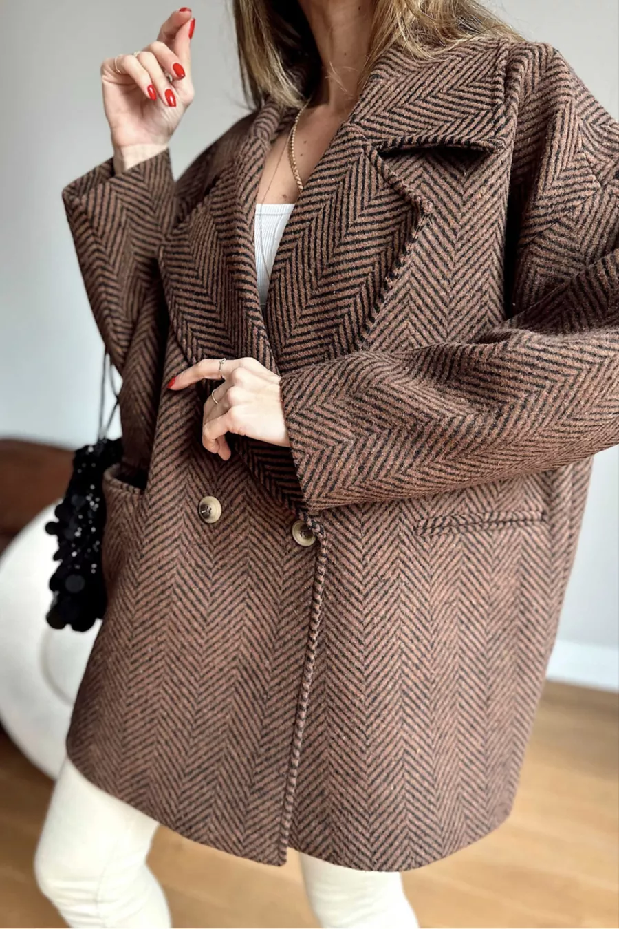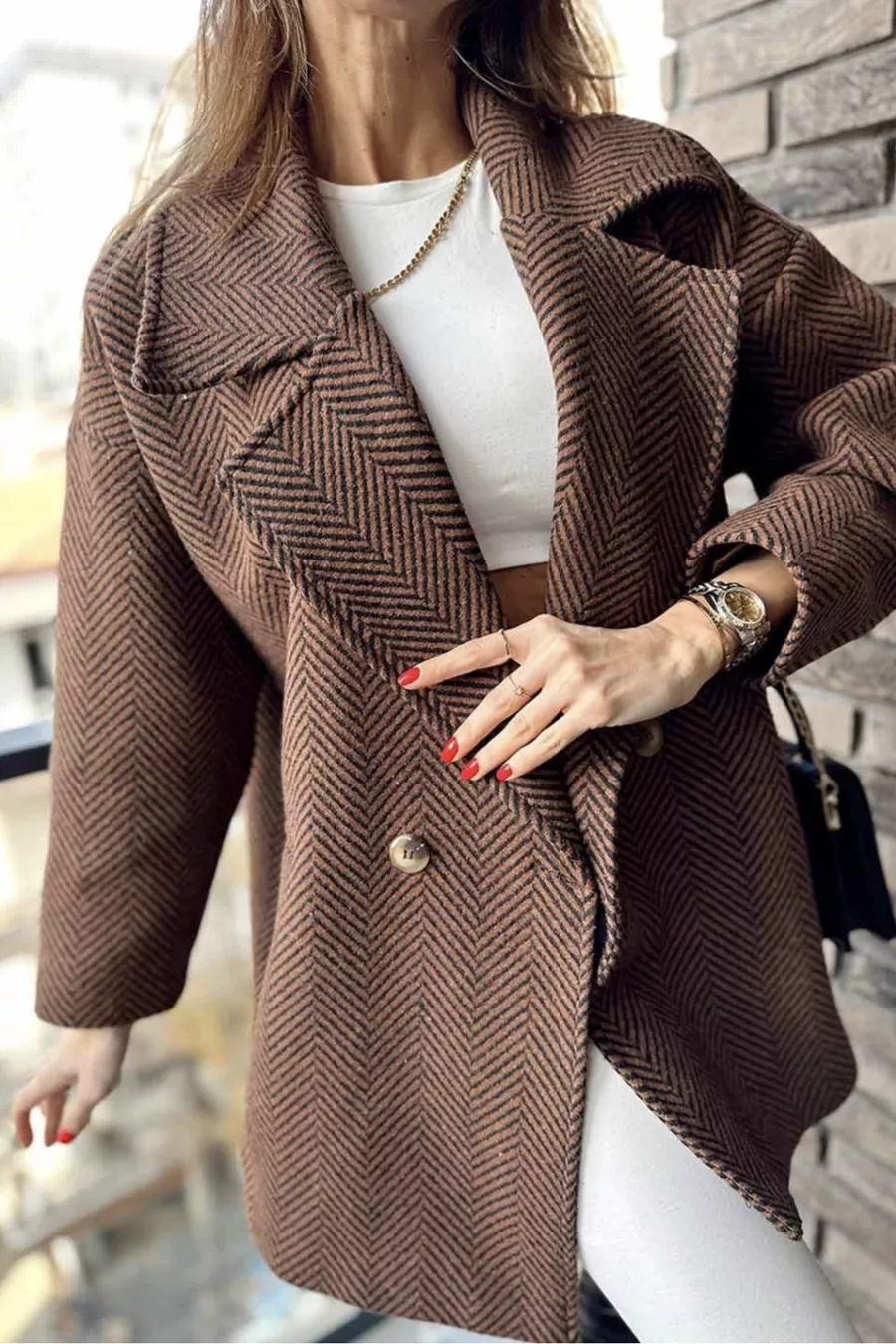 Cappotto corto oversize con fodera, motivo a spina di pesce, colori marrone e nero, taglia standard