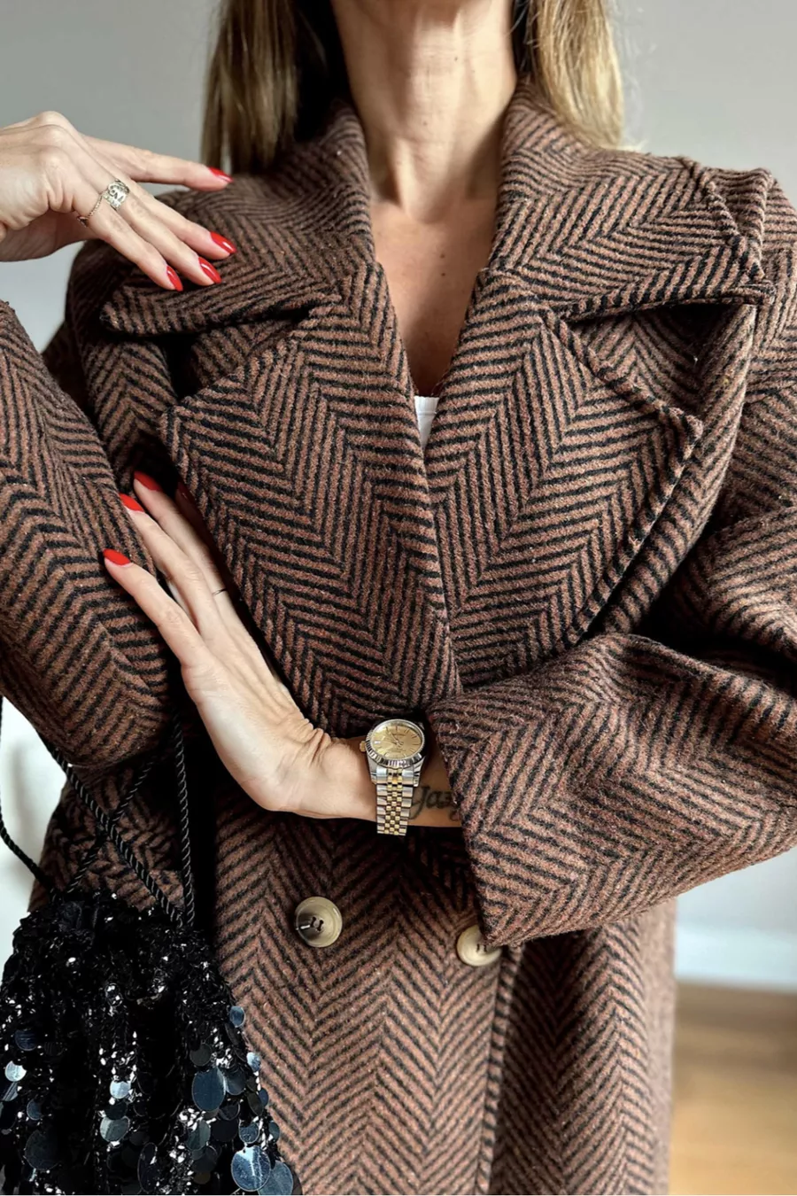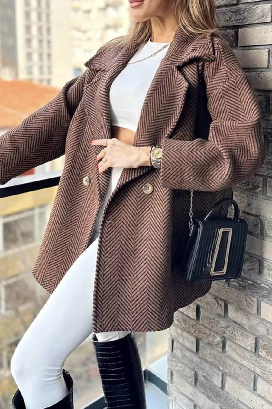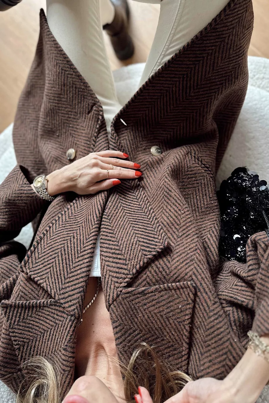 Cappotto corto oversize con fodera, motivo a spina di pesce, colori marrone e nero, taglia standard