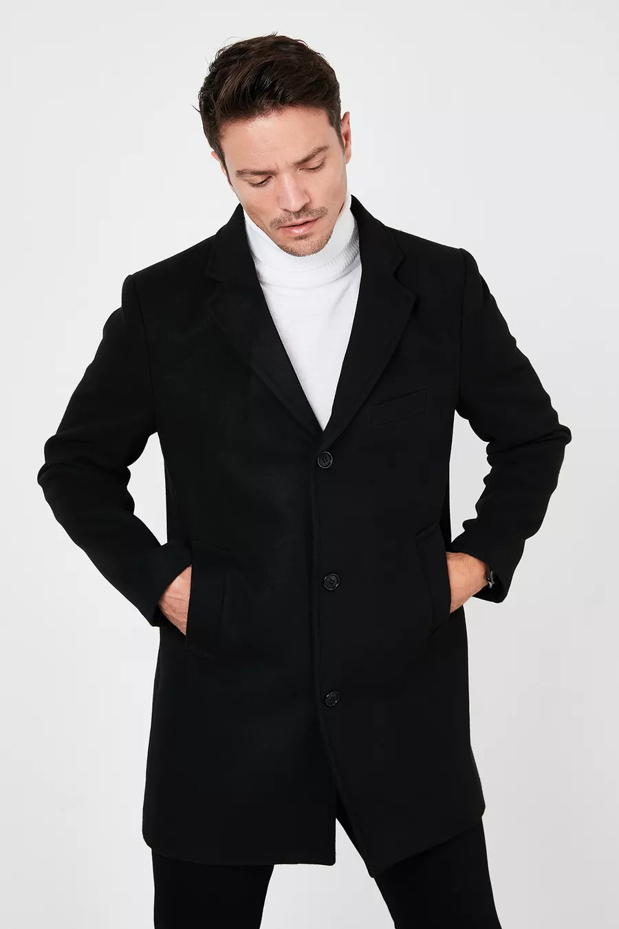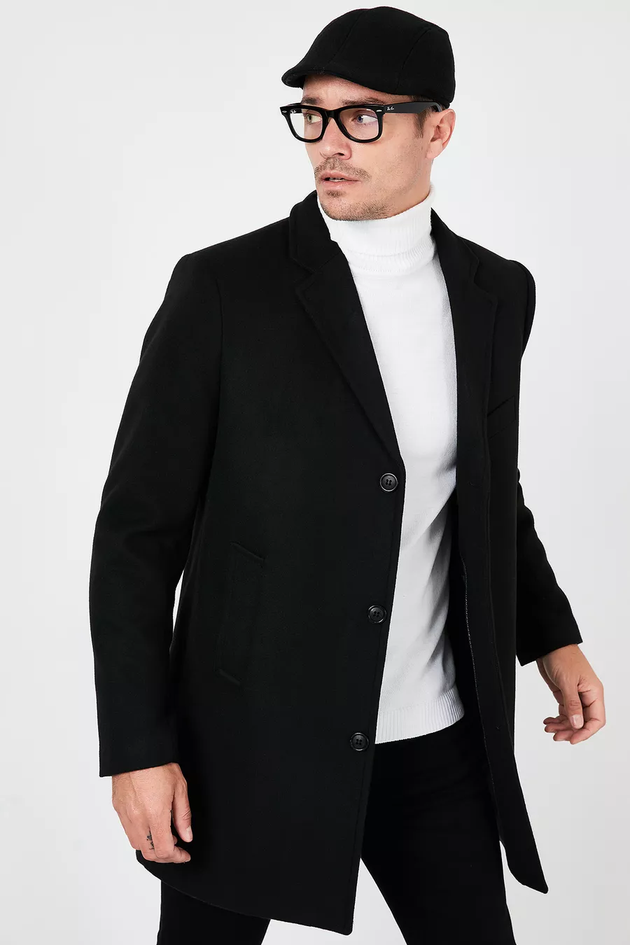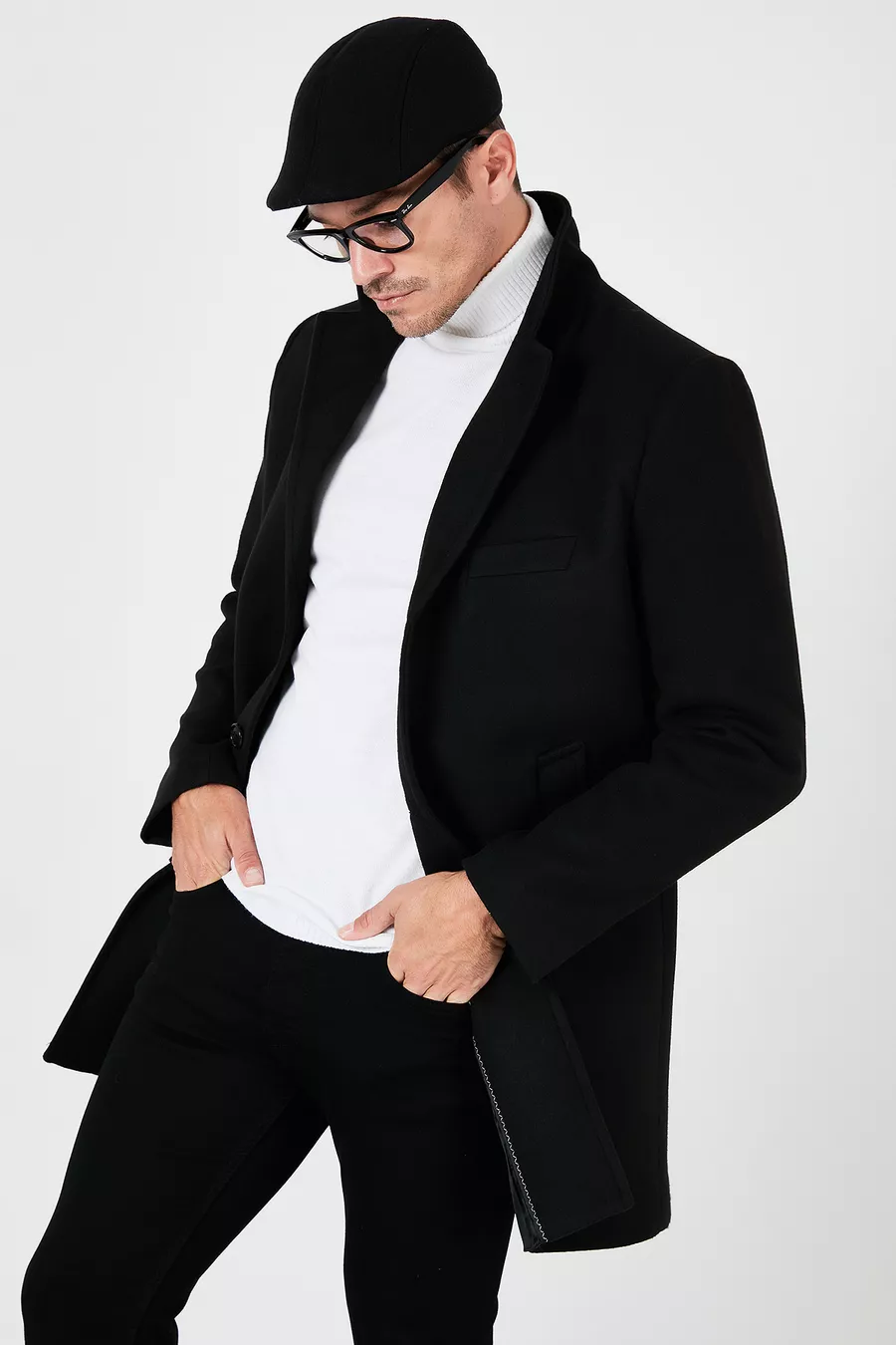 Cappotto da uomo in cashmere con tasca singola, collo a camicia, chiusura con bottoni, modello slim fit, art.
