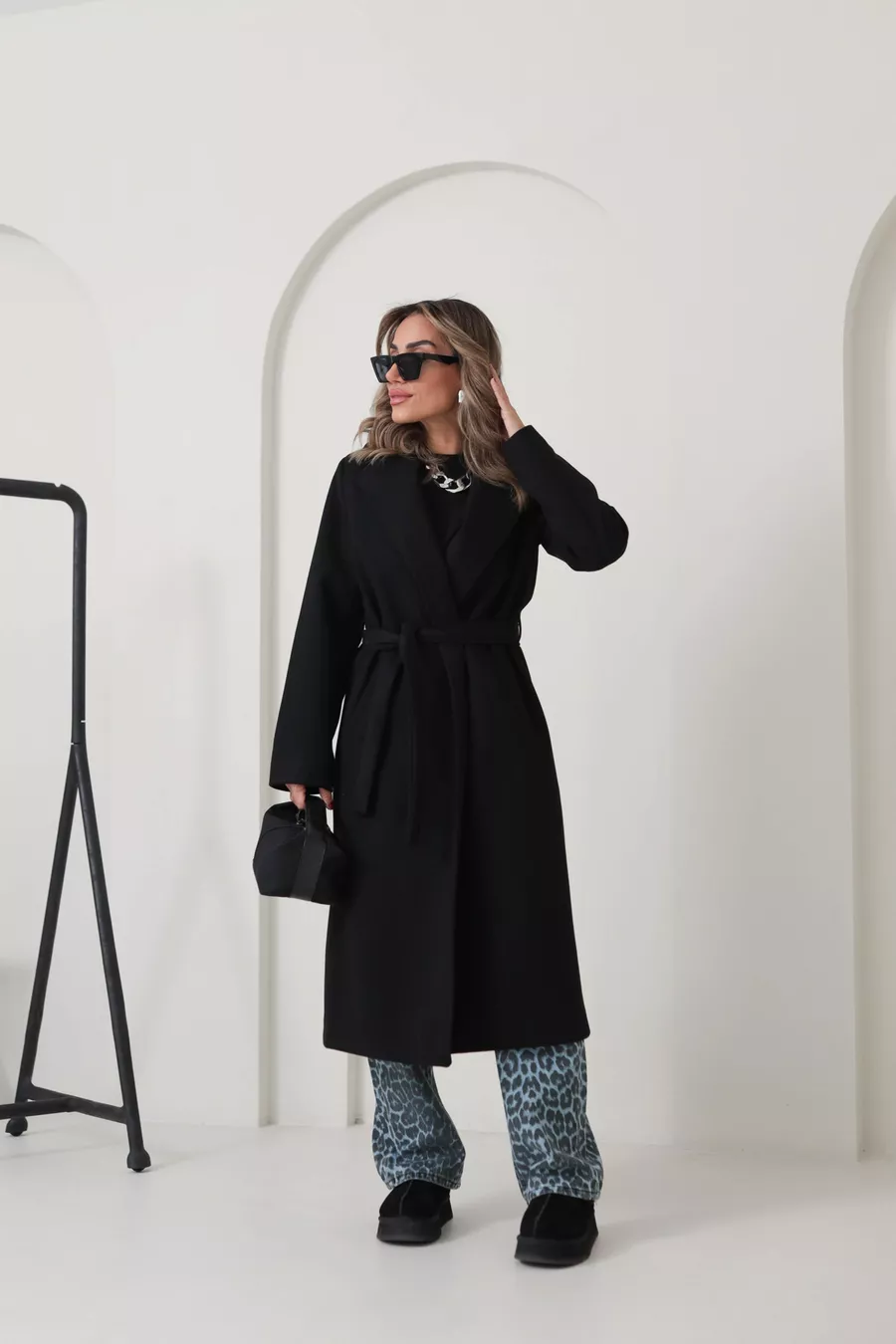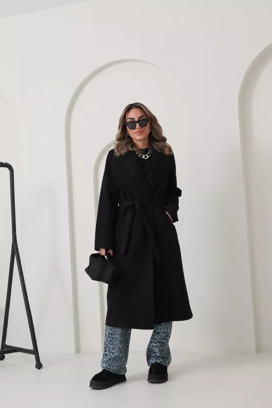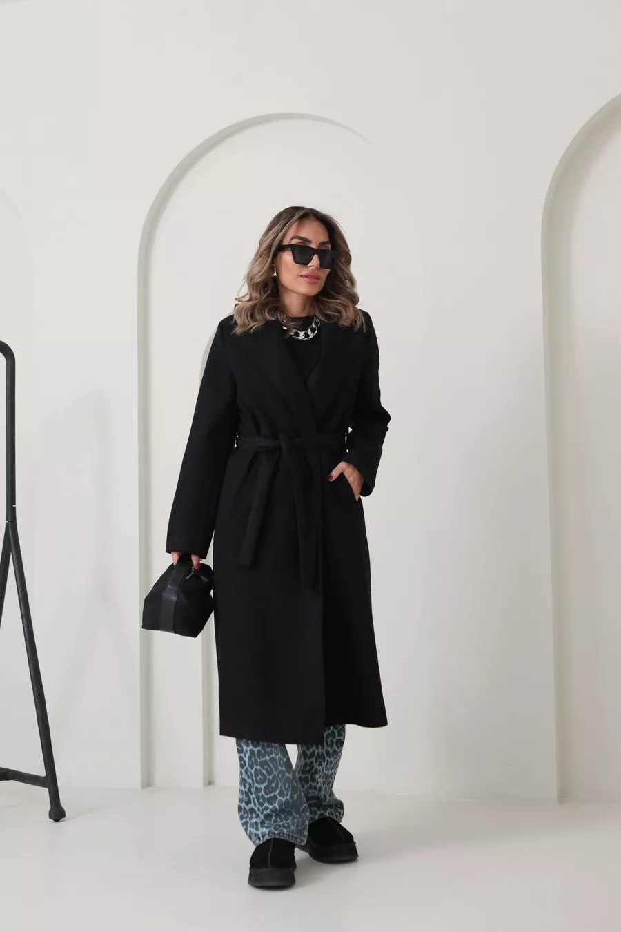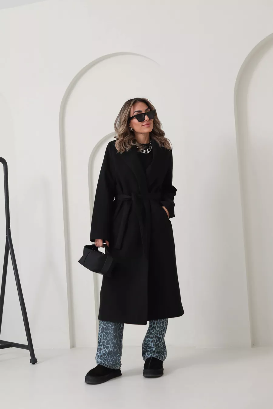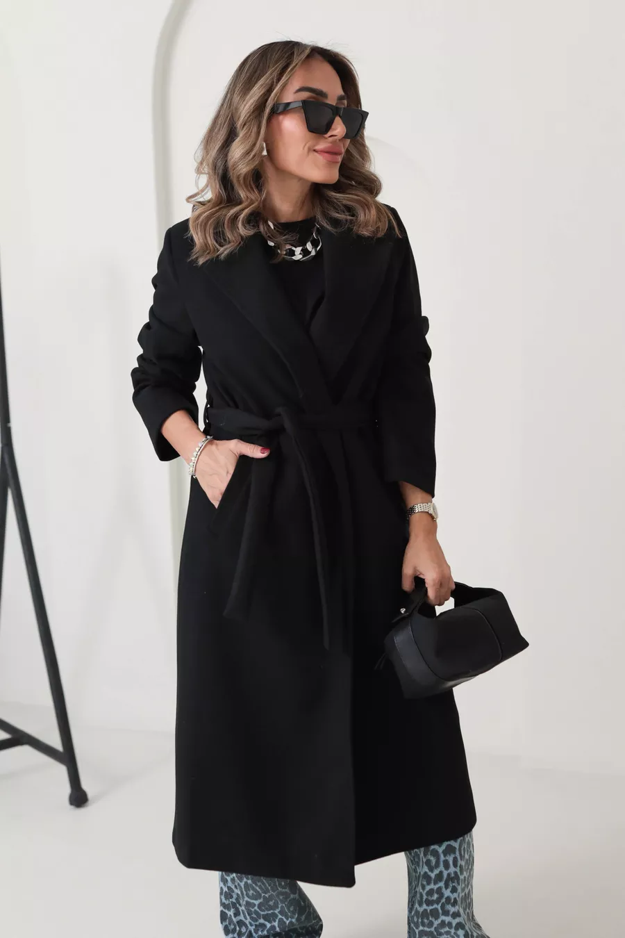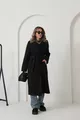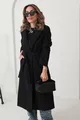 Cappotto lungo oversize da donna con fodera nera, tasche e cintura