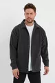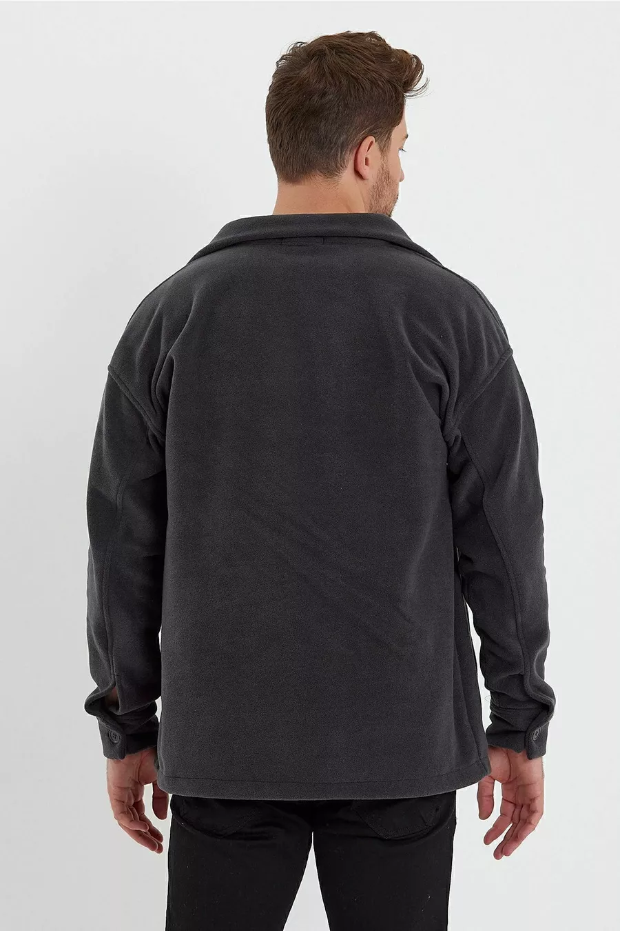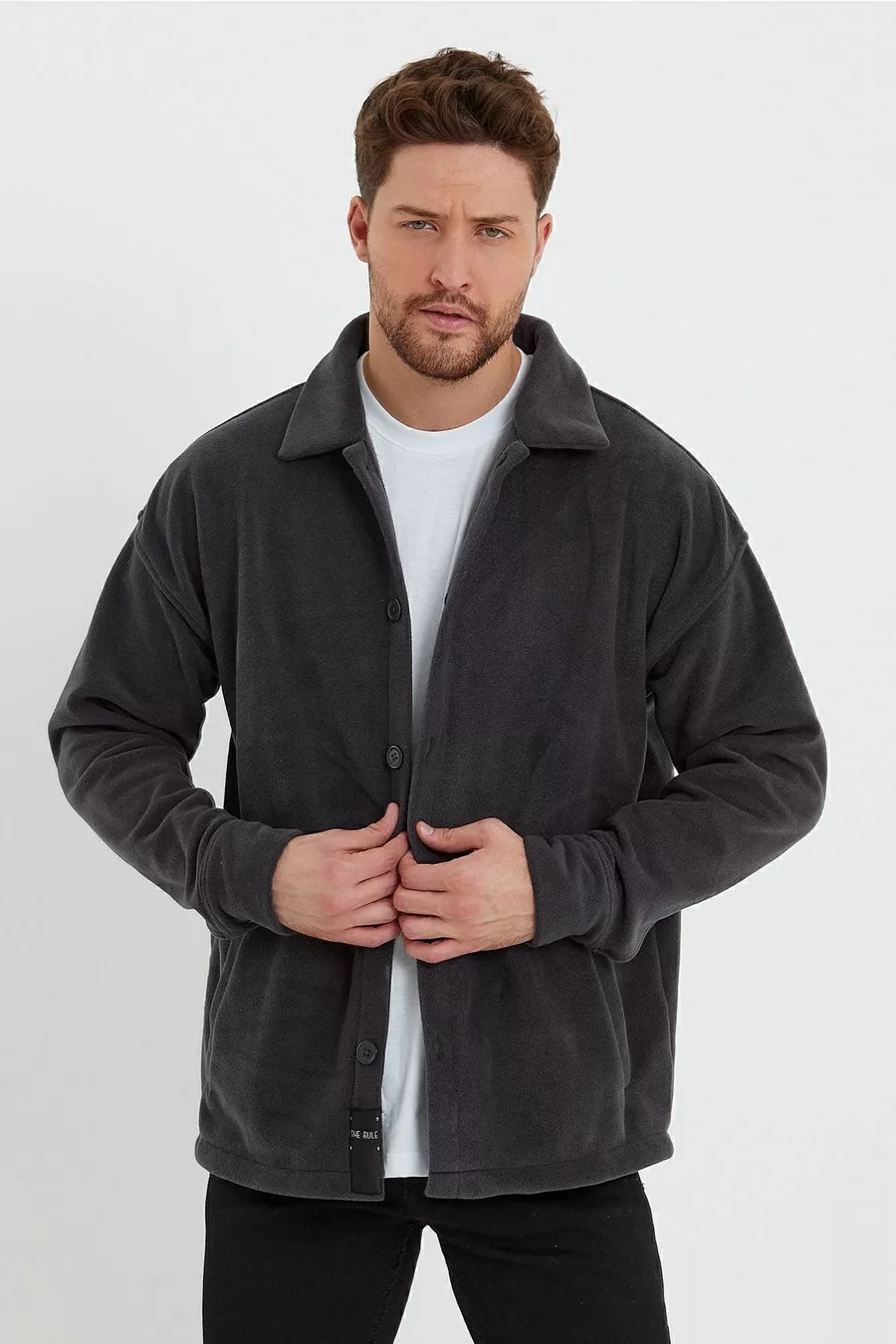 Cardigan da uomo oversize in pile antracite, collo a camicia, taglio ampio, resistente al freddo e che non produce pallini