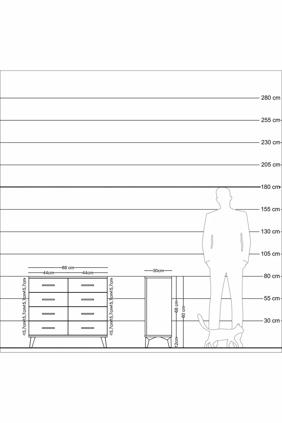 Colore: Bianco Materiale: Truciolare laminato Altezza: 80 cm Larghezza: 88 cm Profondità: 30 cm Numero di cassetti: 8 Caratteristica del prodotto: Con ante Stile: Moderno Tema / Stile: Moderno Provenienza: TR