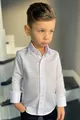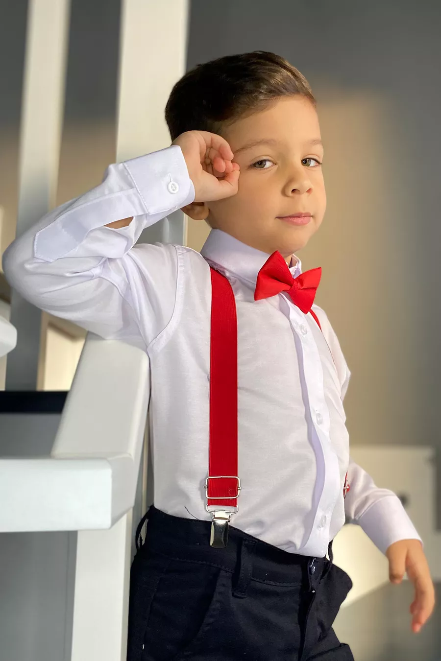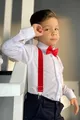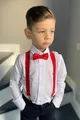 Completo da bambino maschio con camicia bianca a maniche lunghe, bretelle e papillon