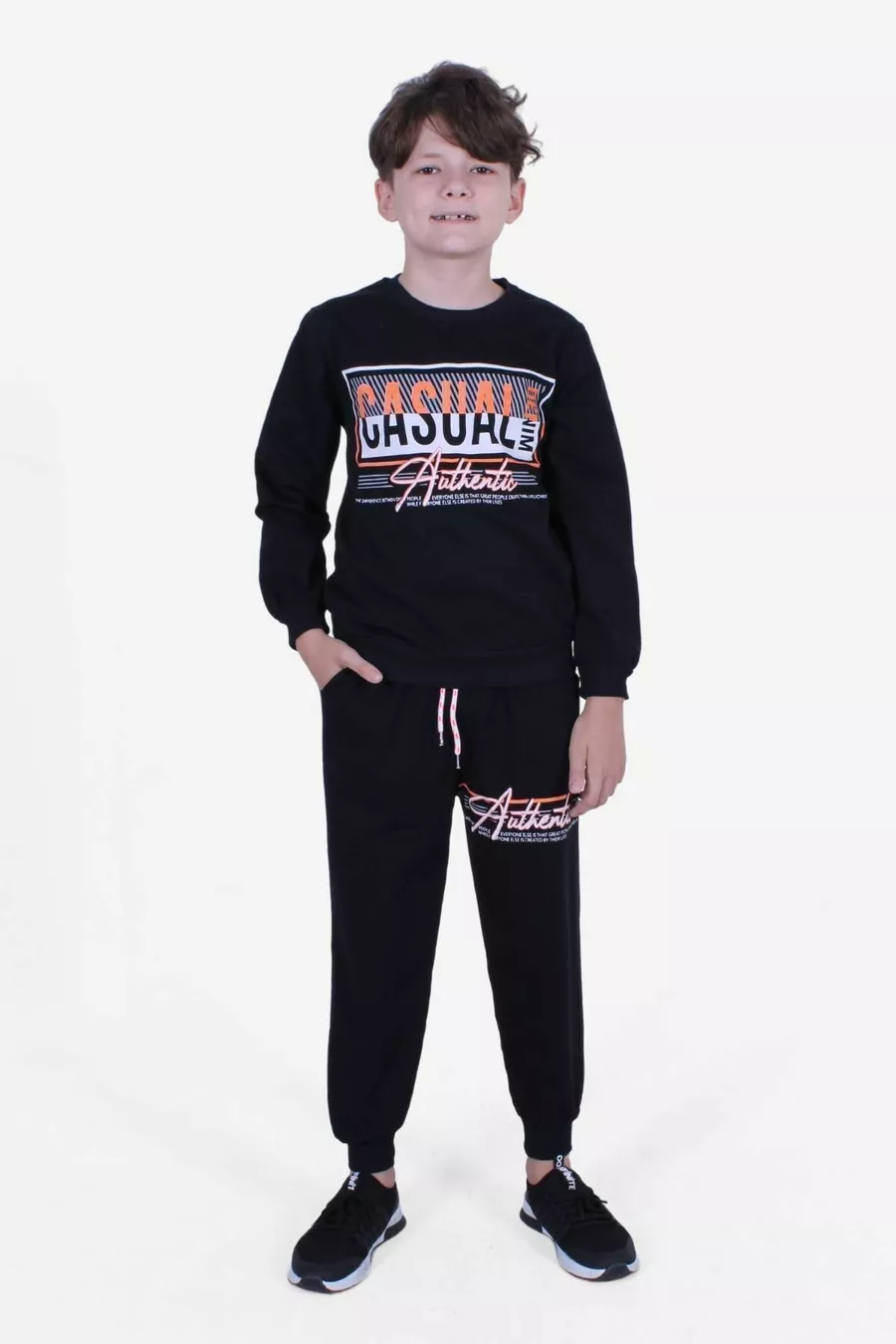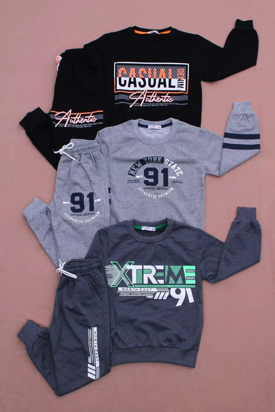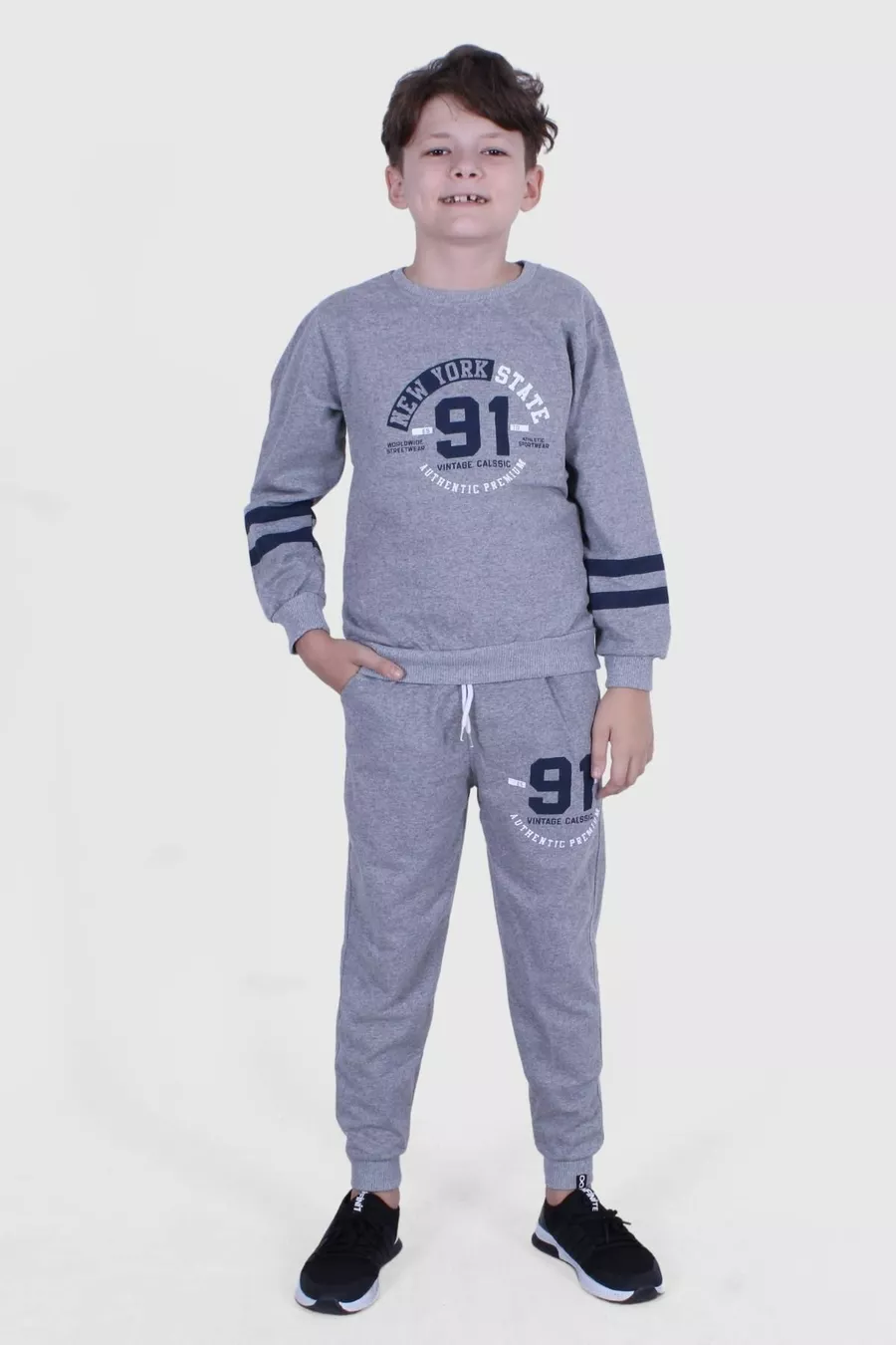 Completo da ragazzo casual 3 pezzi in denim NYC -x North East con stampa, girocollo, felpa e pantaloni neri-grigio-fumo