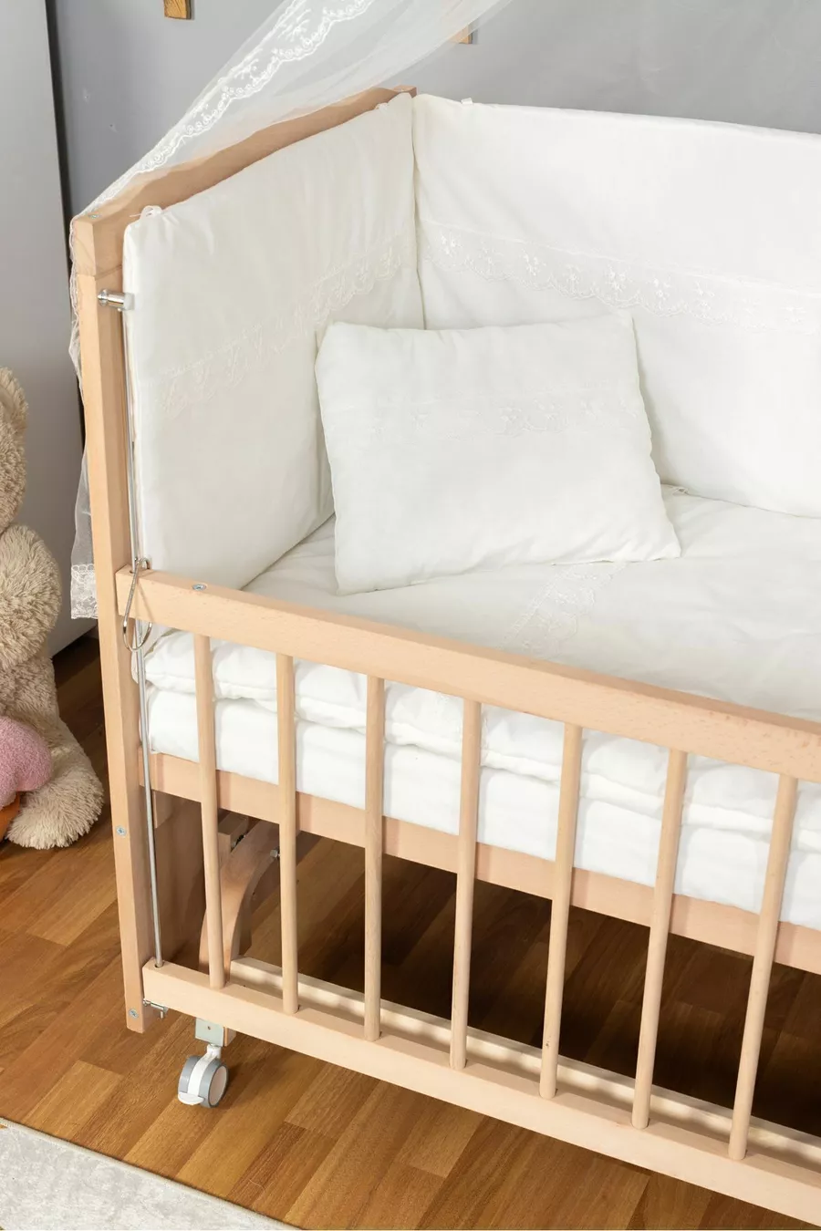 Culla in legno naturale accanto alla mamma per neonati (SENZA VERNICE) Set letto con pizzo crema con ruote