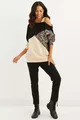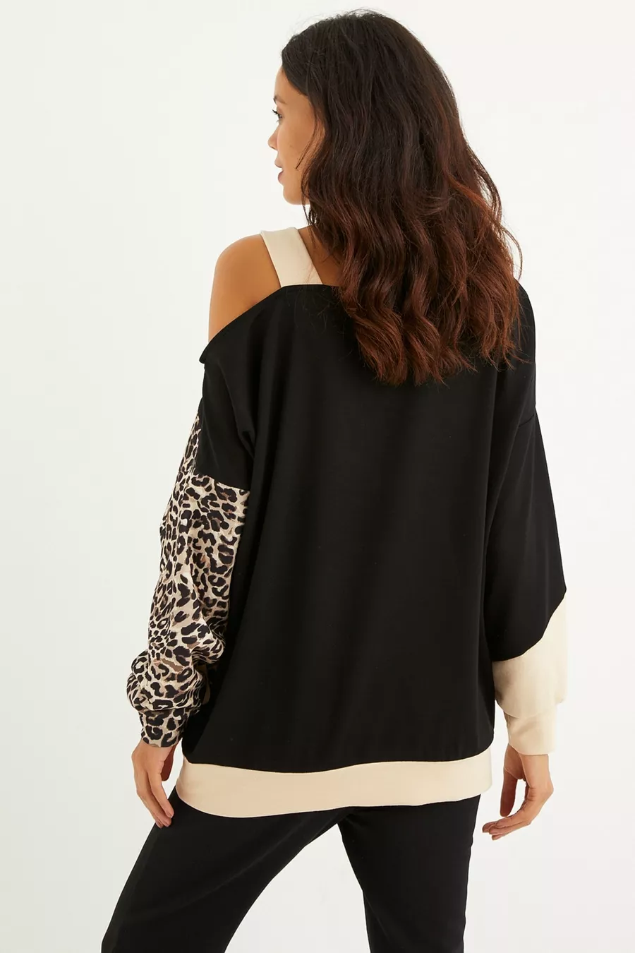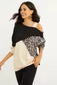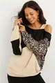 Felpa da donna monospalla cammello-nera con stampa leopardata a blocchi