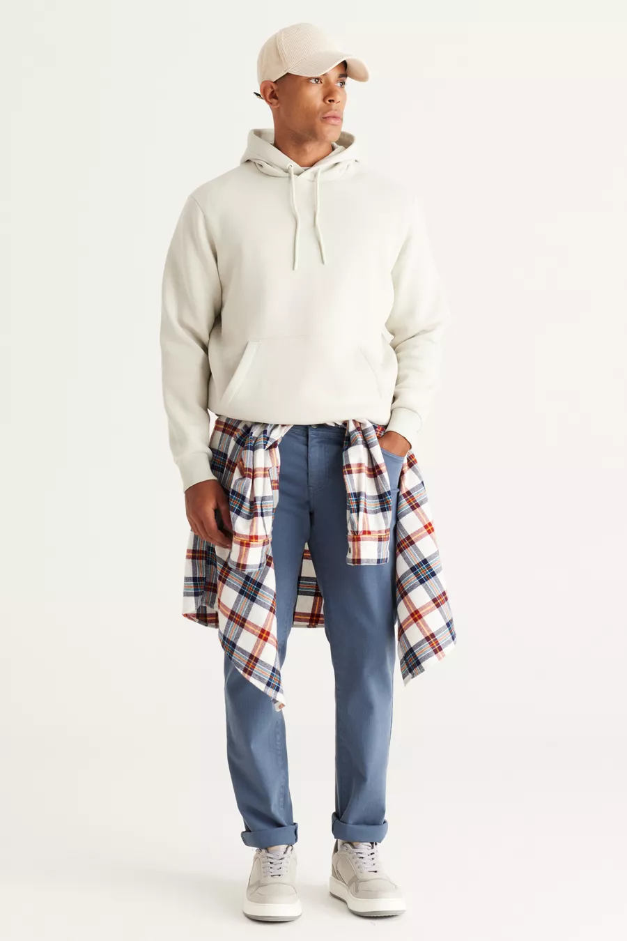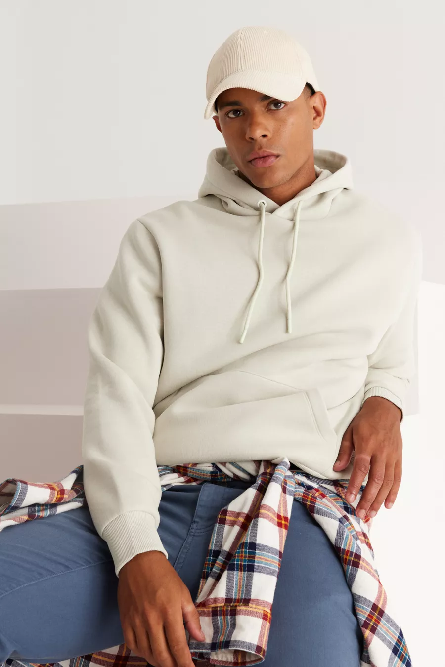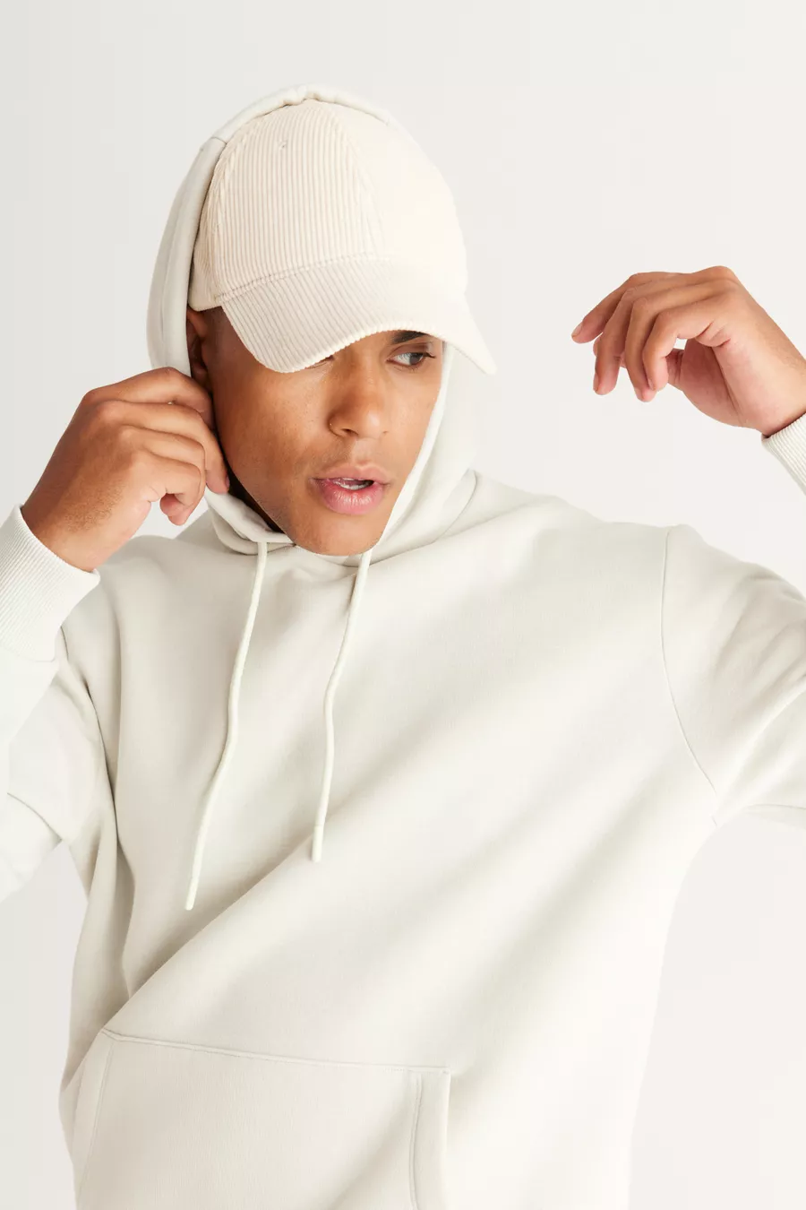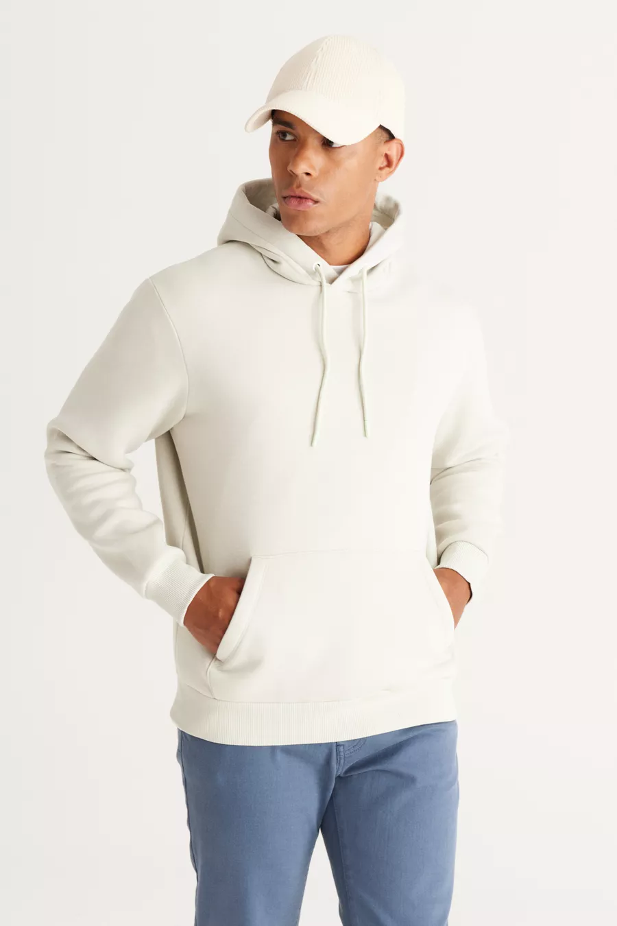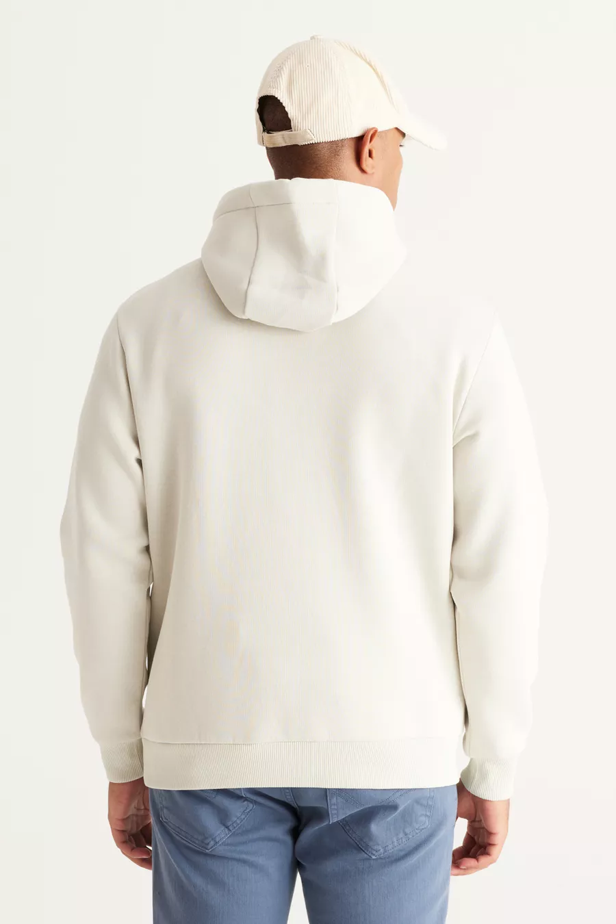 Felpa da uomo beige in cotone con cappuccio, interno in pile, cucitura a 3 fili, vestibilità standard