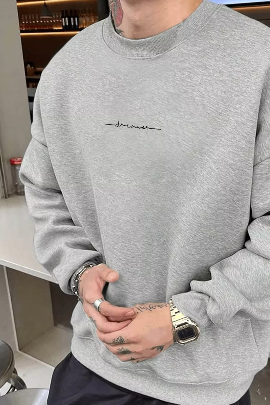 Felpa da uomo grigia Dreamer con stampa, collo tondo, oversize, ampia, in pile