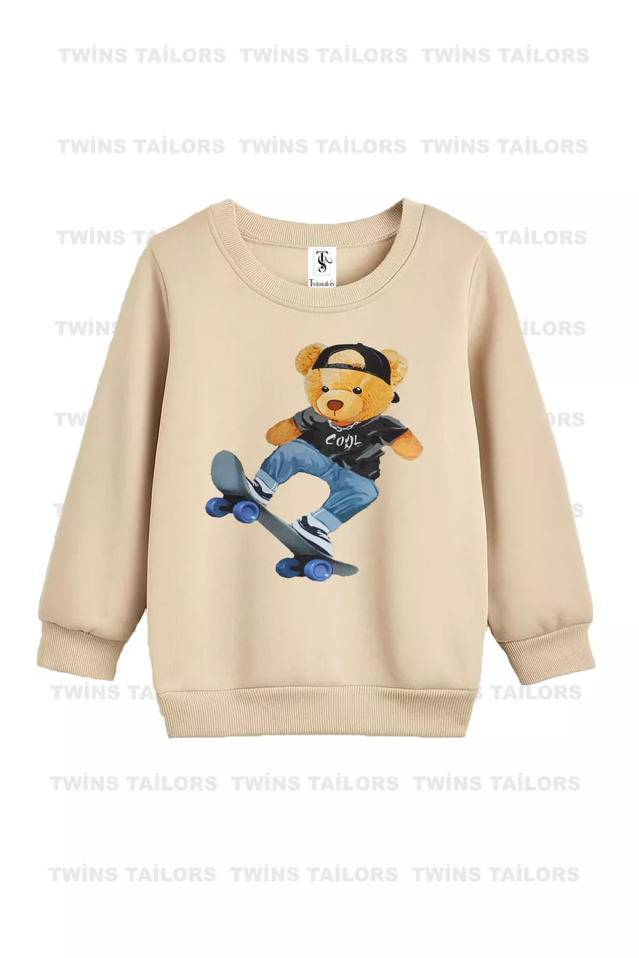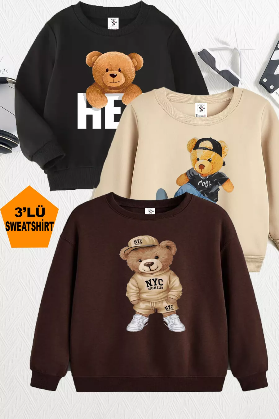 Felpa per bambini unisex con stampa orso di peluche, confezione da 3 pezzi, beige-nero-marrone
