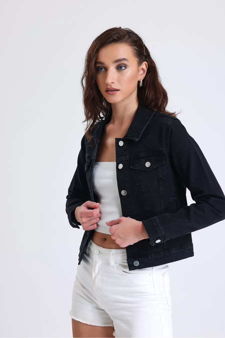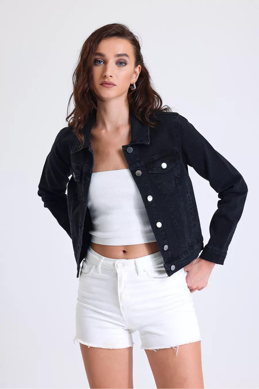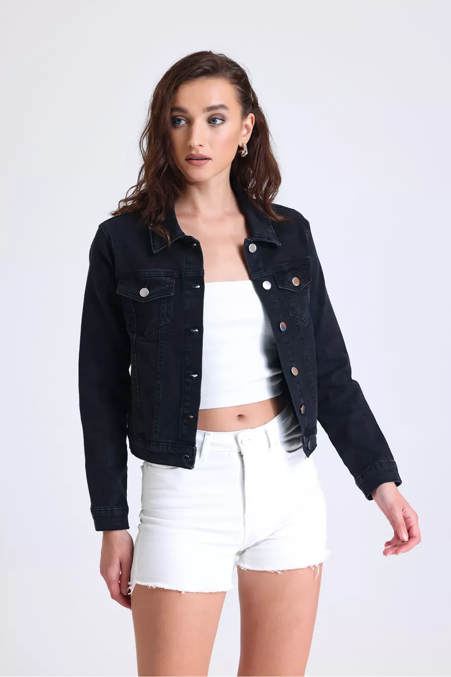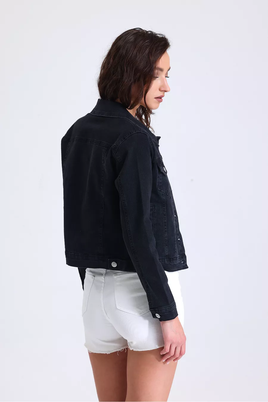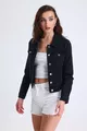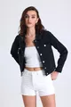 Giacca di jeans nera da donna, corta, elasticizzata