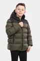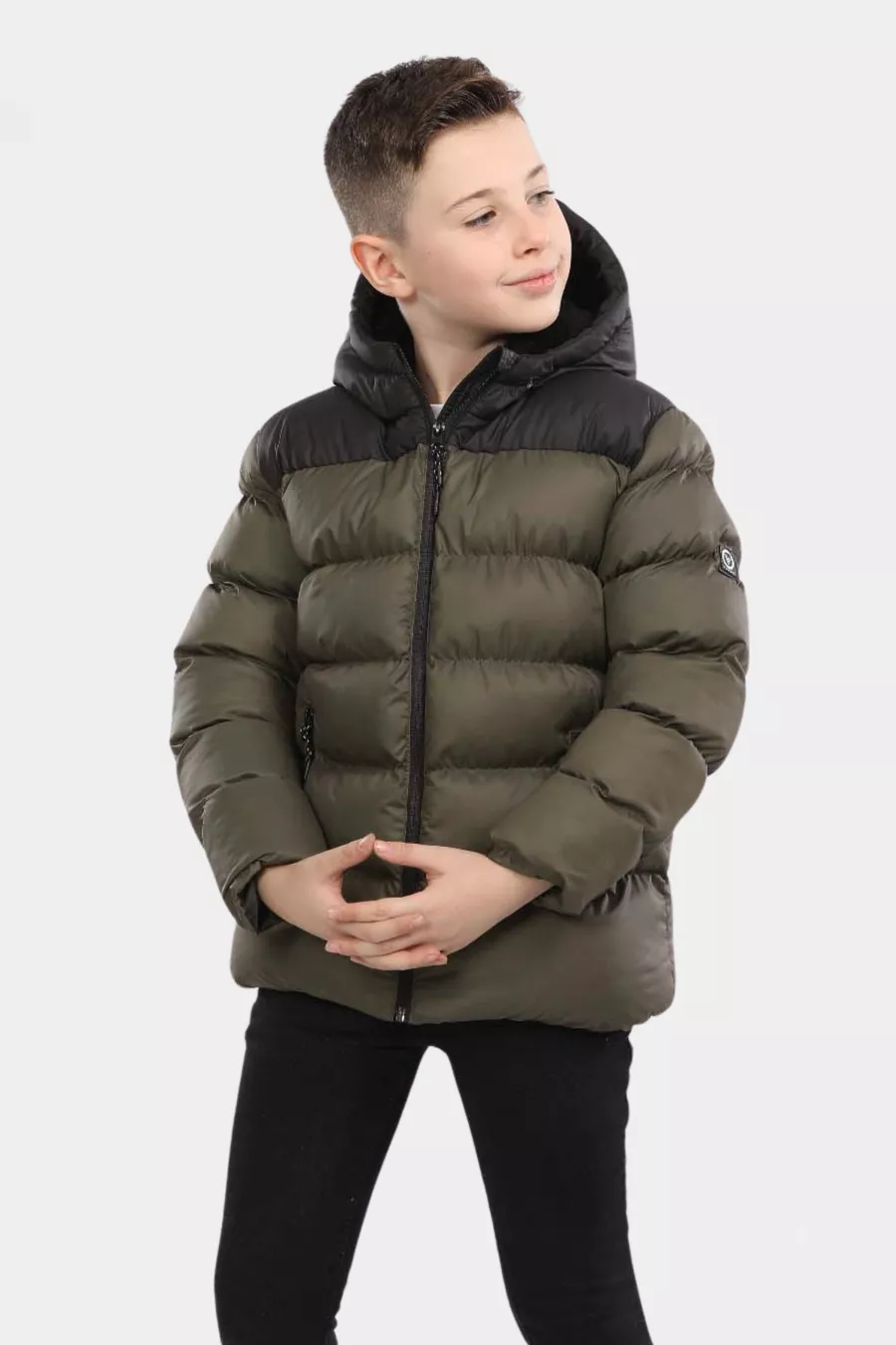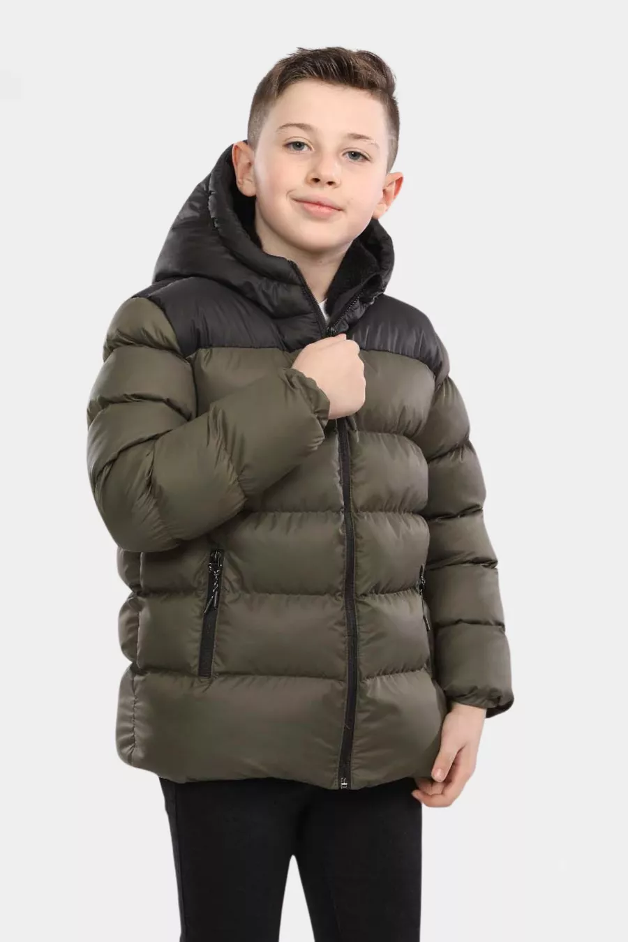 Giacca invernale impermeabile da ragazzo, verde militare, con interno in pile e cappuccio spesso, stile patch con pelliccia