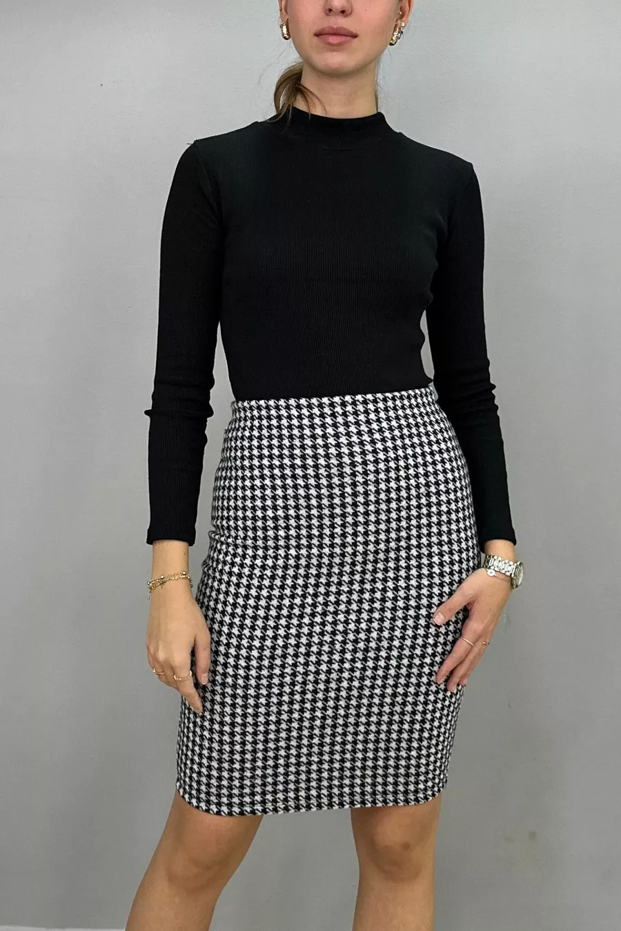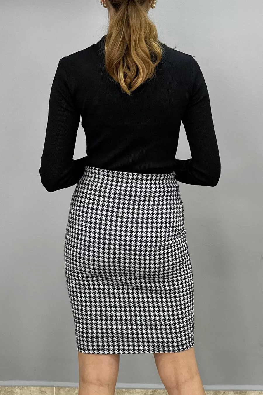 Gonna a matita da donna fantasia pied de poule bianco-nero