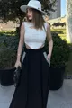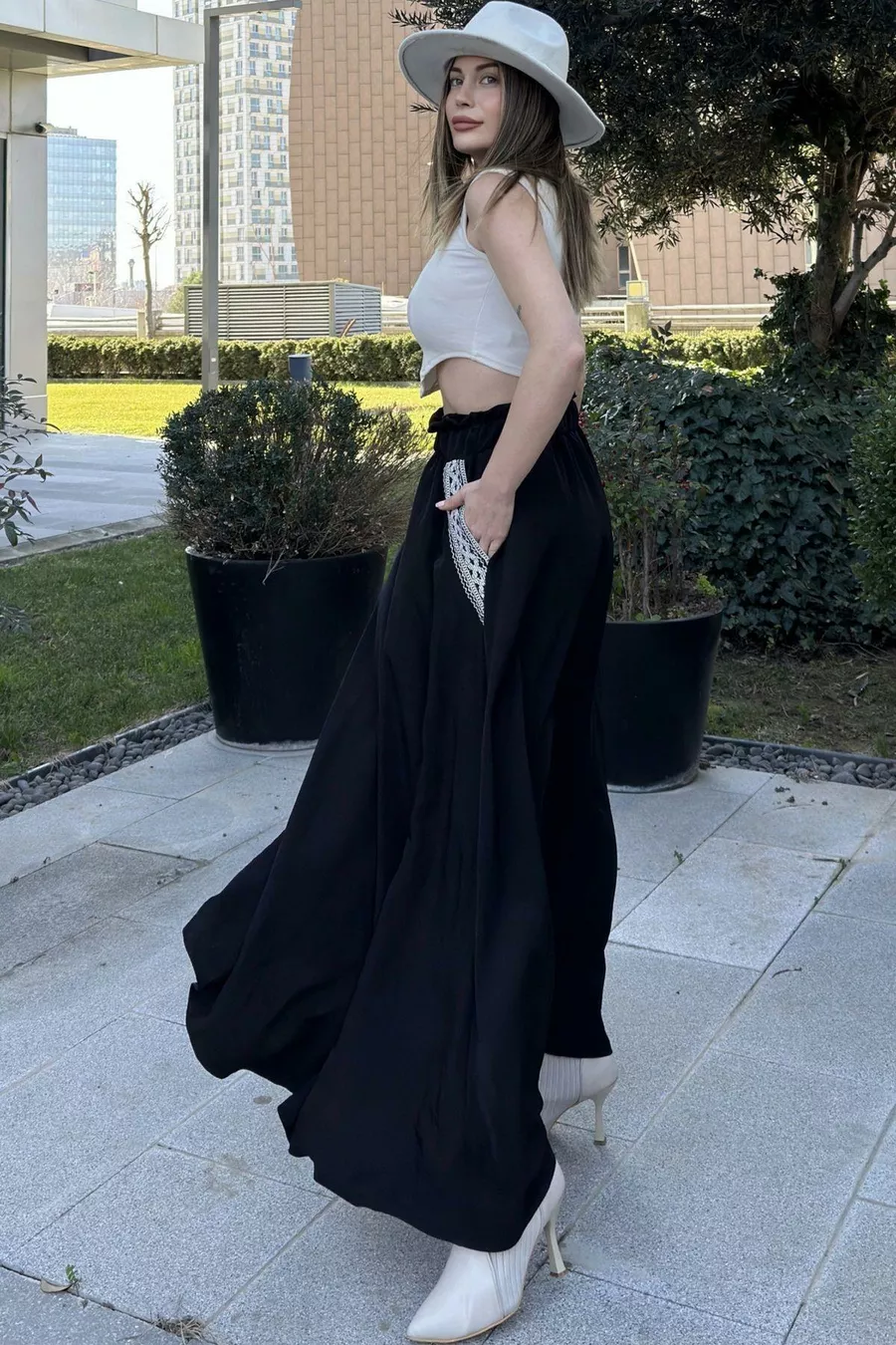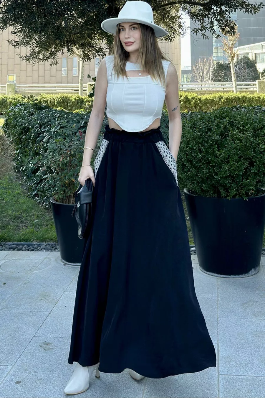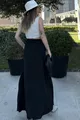 Gonna lunga a trapezio da donna, nera, con elastico in vita, tasche ricamate a rattan, taglio comodo