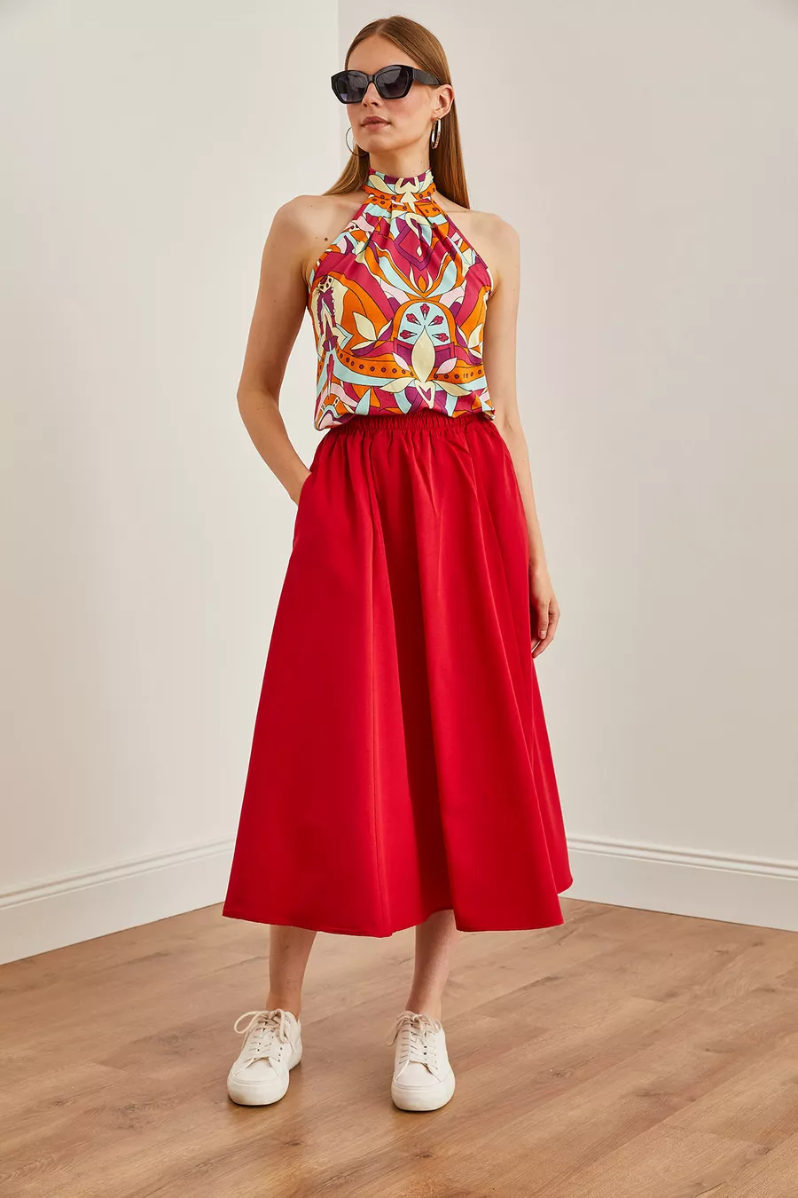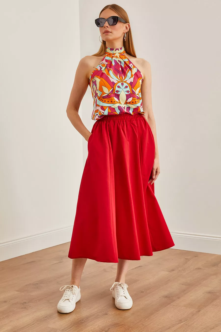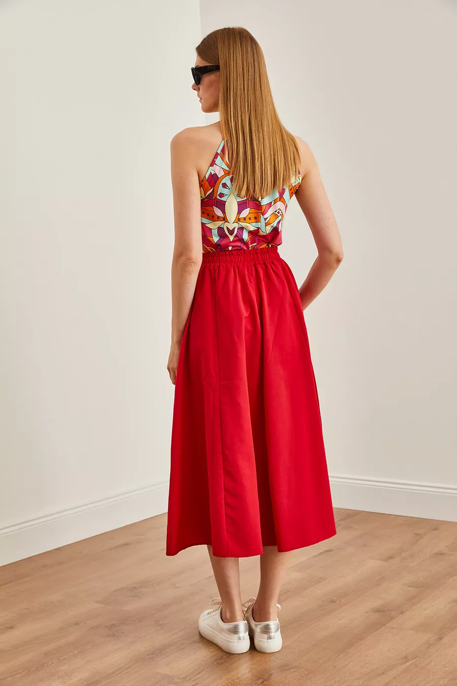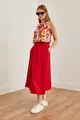 Gonna Midi Donna in Tessuto con Vita Elastica e Tasche Rosse a Campana