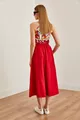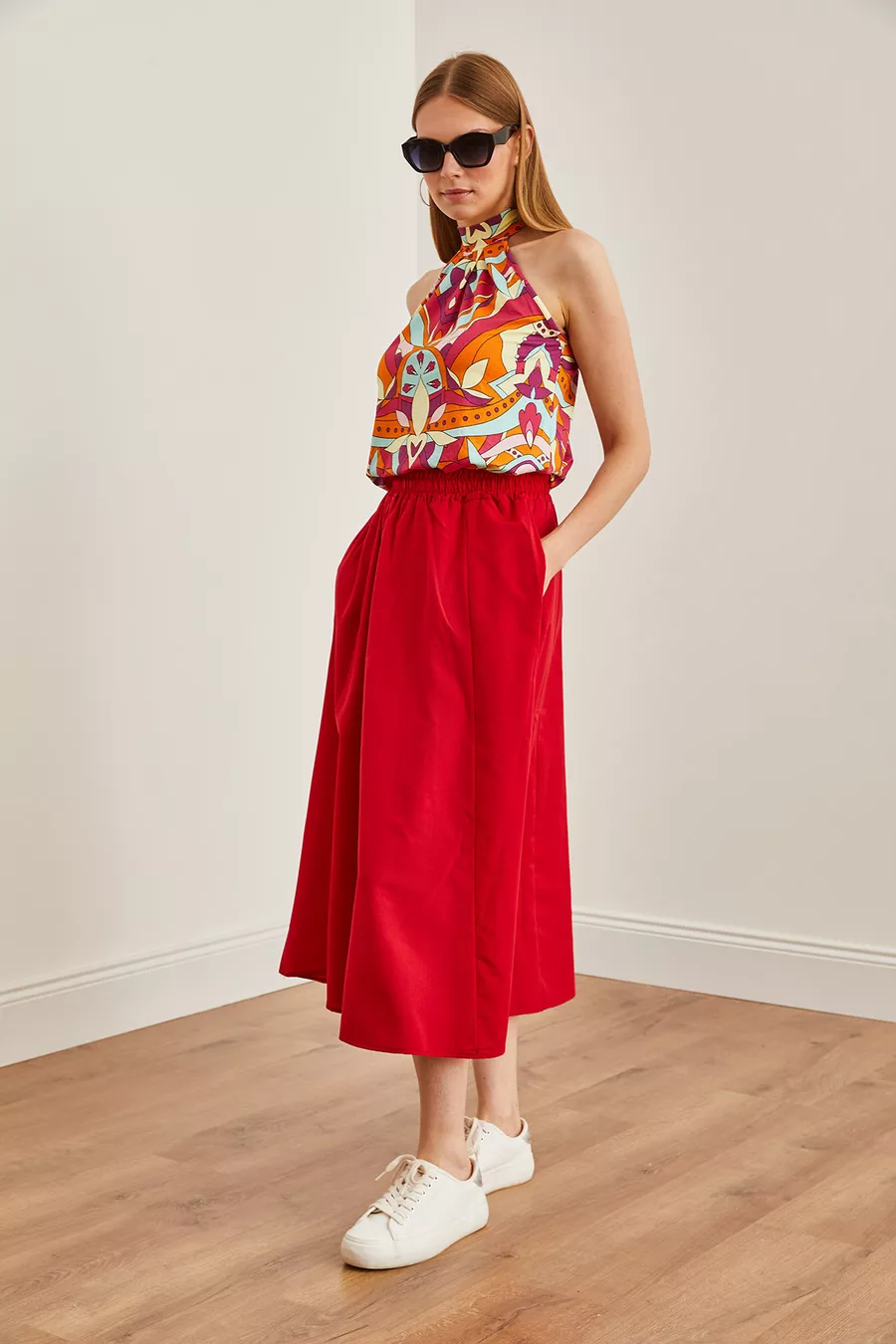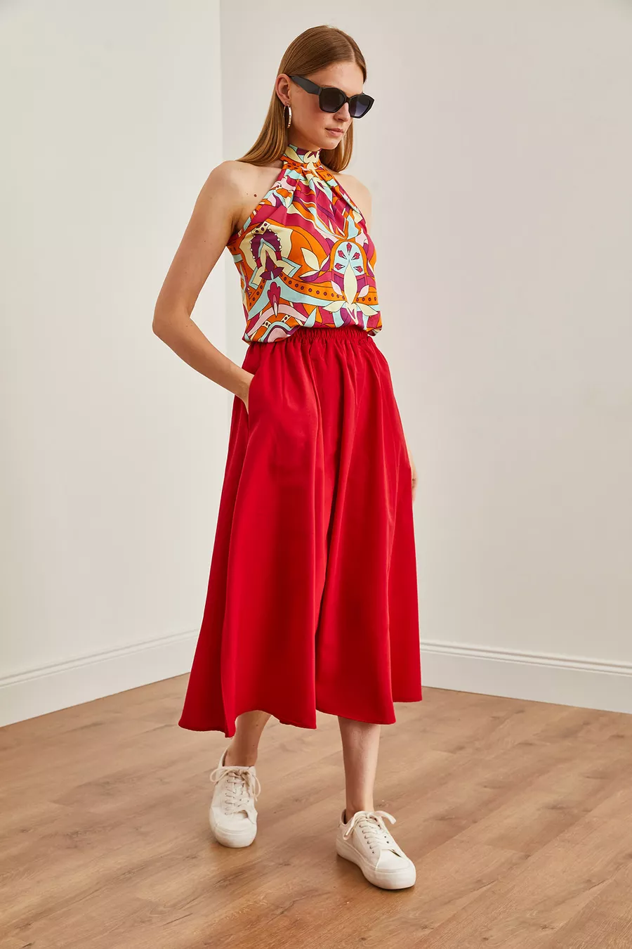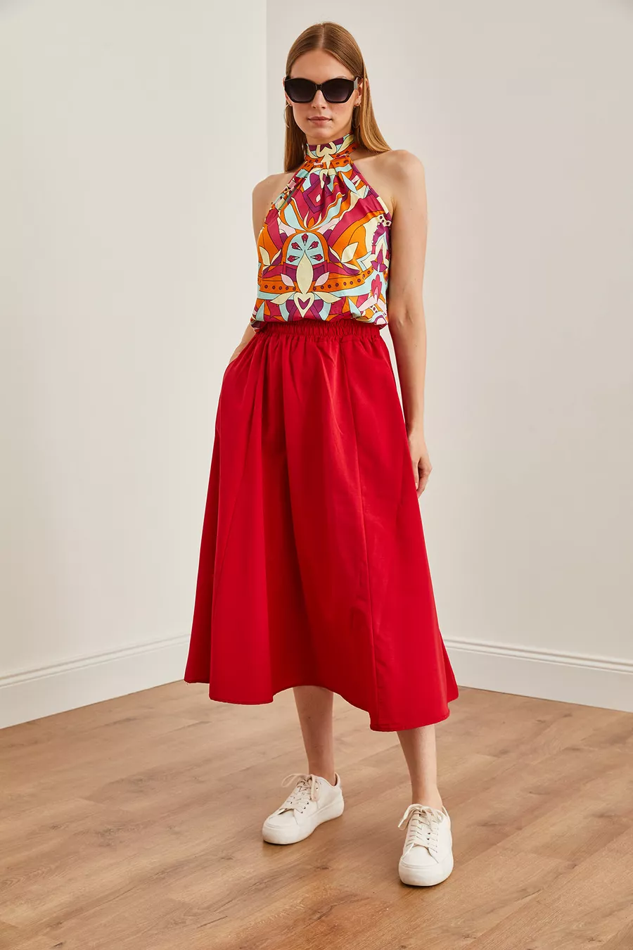 Gonna Midi Donna in Tessuto con Vita Elastica e Tasche Rosse a Campana