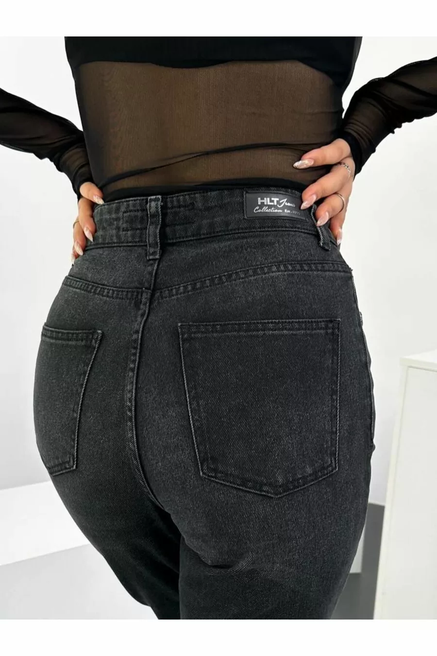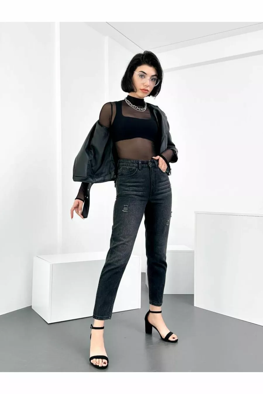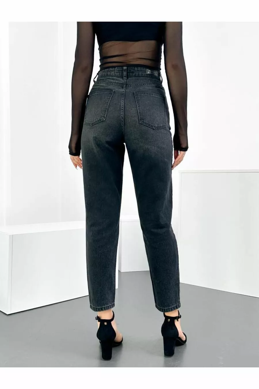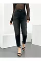 Jeans da donna mom neri effetto consumato, vita alta, senza elastan, % cotone, modello Anna