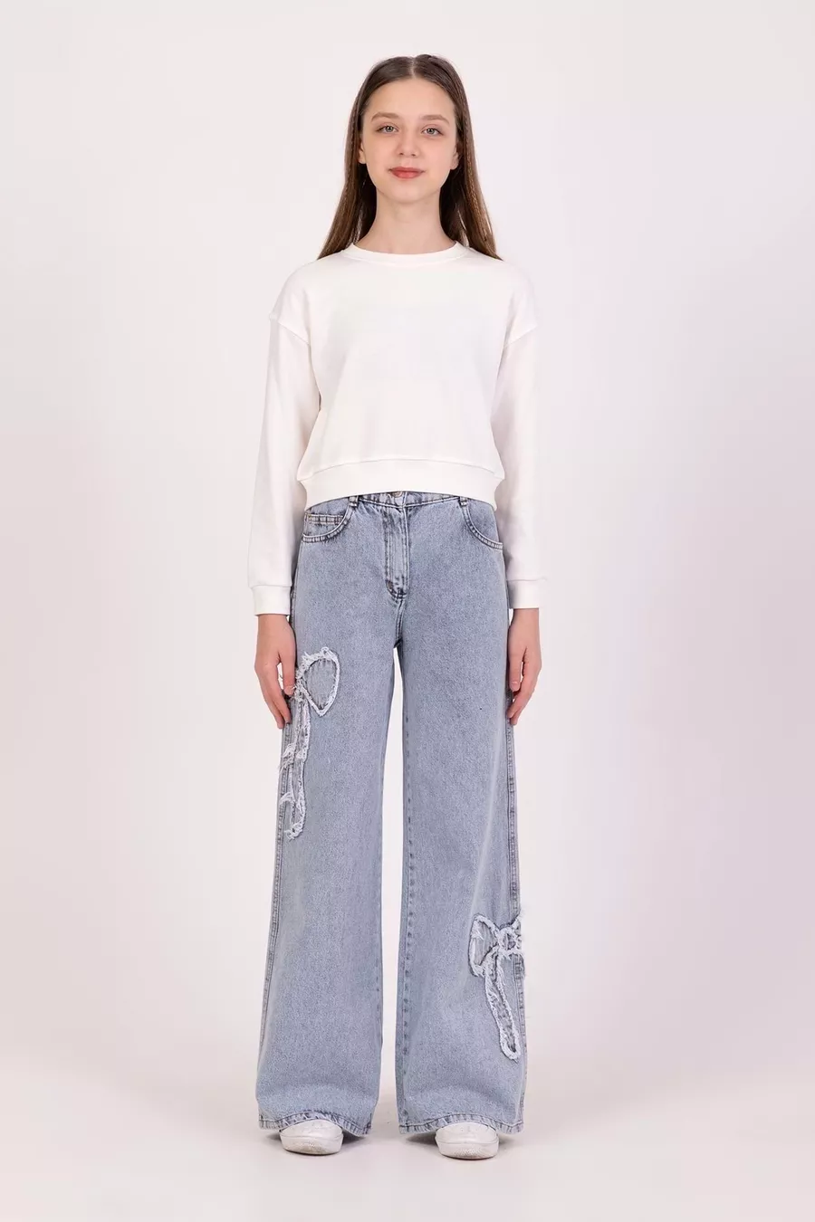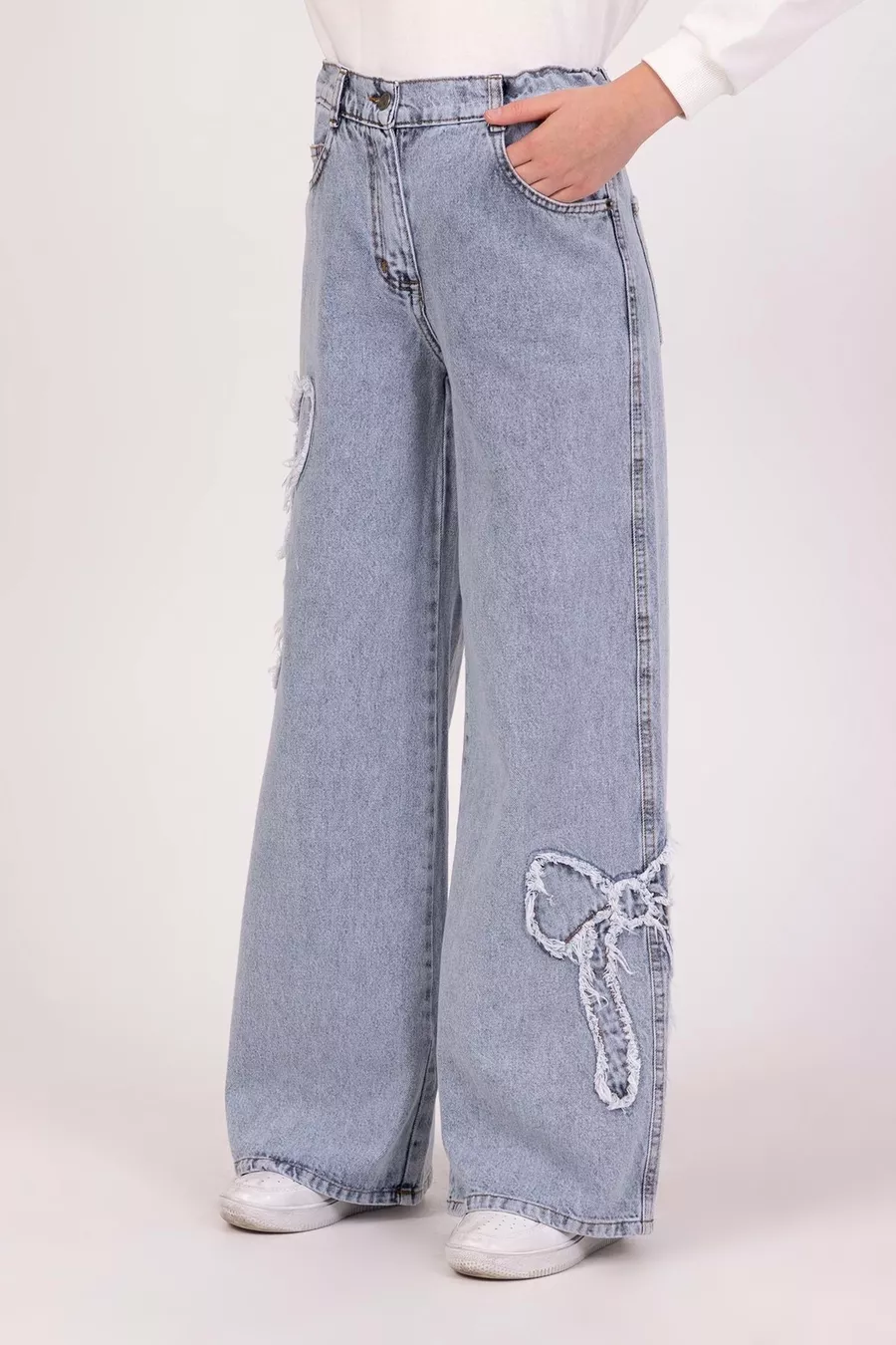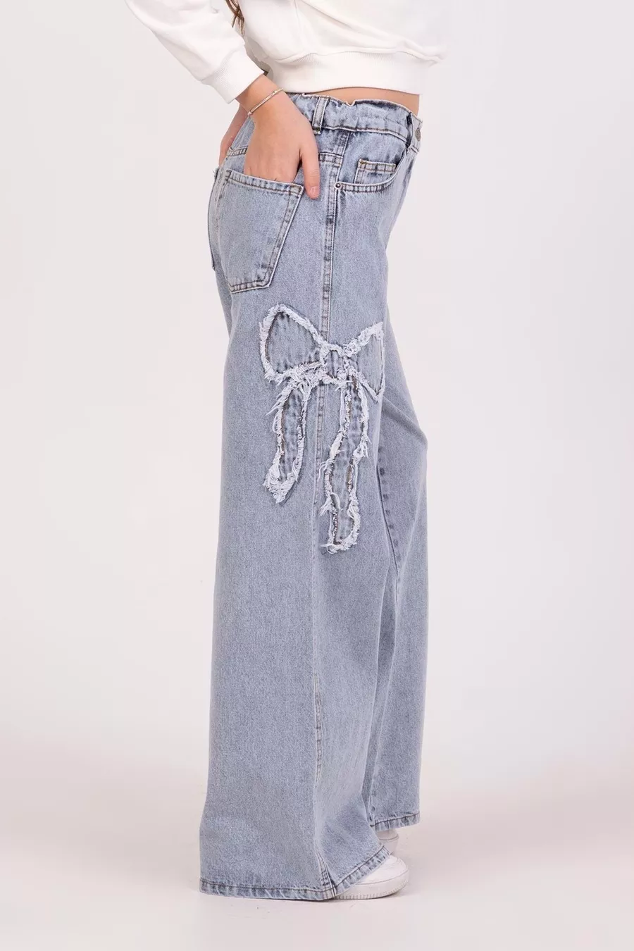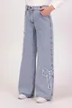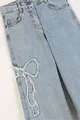 Jeans da bambina in denim con fiocco e ricamo, gamba larga e tessuto morbido