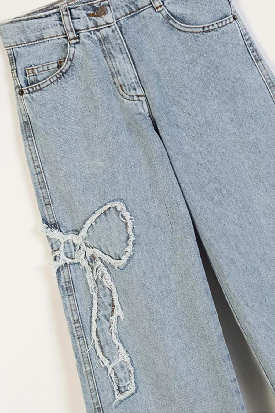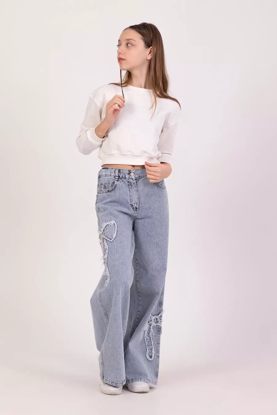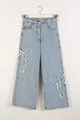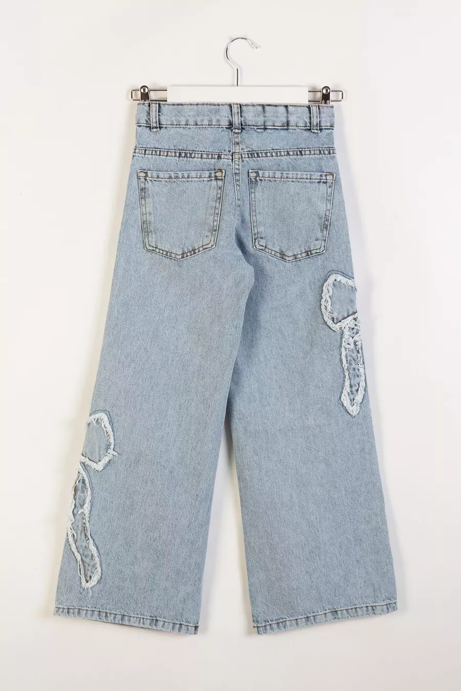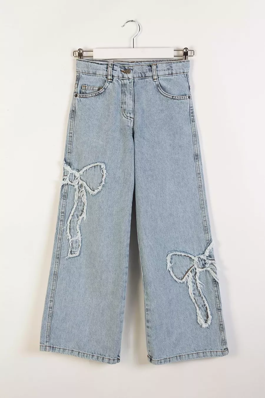 Jeans da bambina in denim con fiocco e ricamo, gamba larga e tessuto morbido