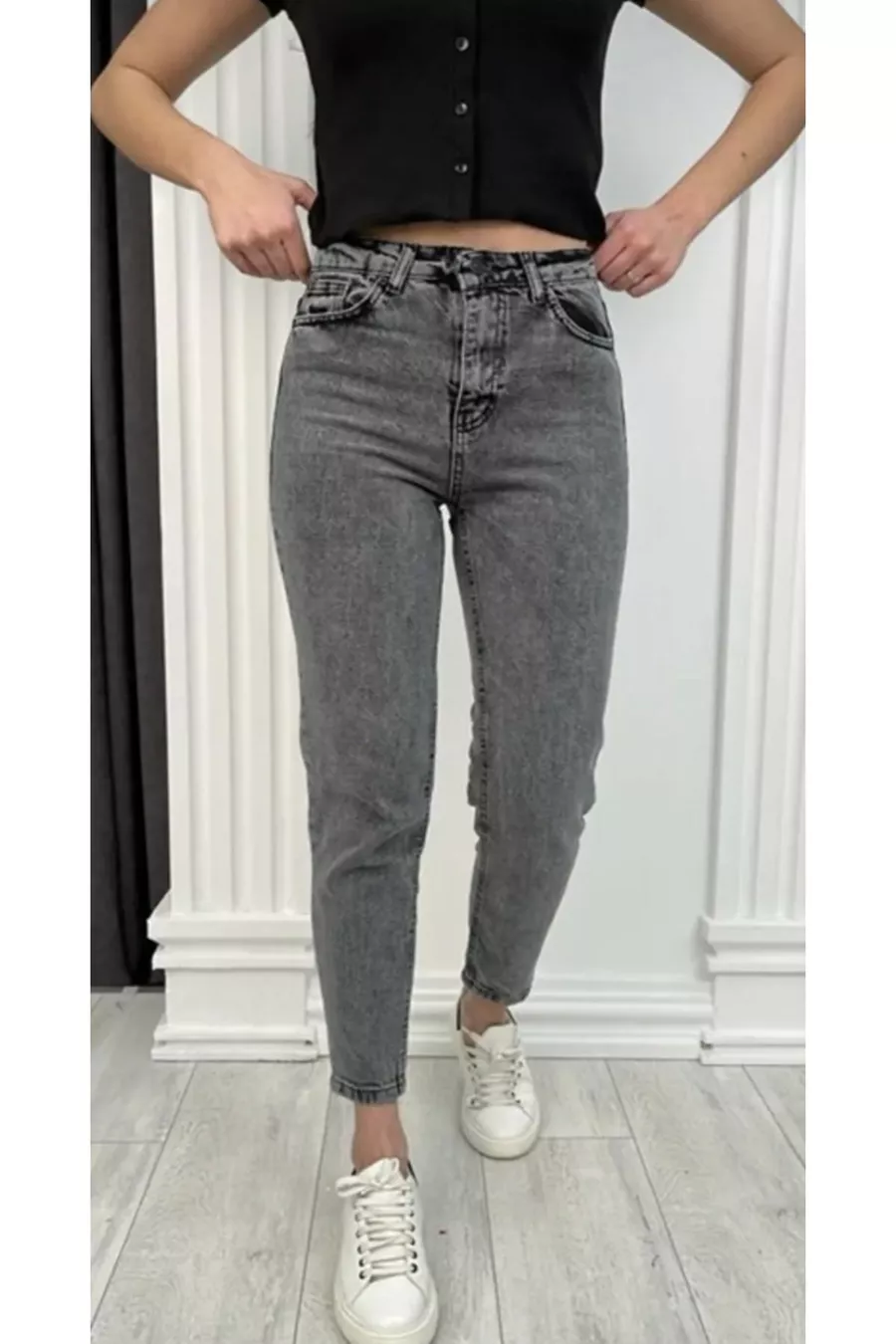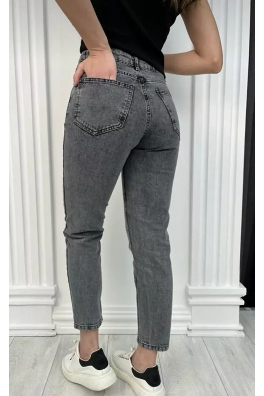 Materiale: Cotone - Poliestere - Elastan Tipo di tessuto: Denim Tipo di pantalone: Gamba stretta Vita: Alta Motivo: Liscio Colore: Grigio Tasche: 5 tasche Dettaglio prodotto: Con bottoni Collezione: Base Spessore: Medio Fodera: Senza fodera Lunghezza: Regular Sagoma: Mom Ambiente: Giovane Taglio: Mom Persona: Fashion Forward Tecnica di stampa/ricamo: Senza stampa Cintura: Senza cintura Dettaglio sostenibilità: Organico Istruzioni di lavaggio: Tipo 3