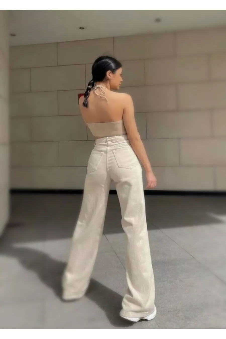 JEANS PALAZZO BEJ % Cotone Vita Alta Larga a Gamba Larga