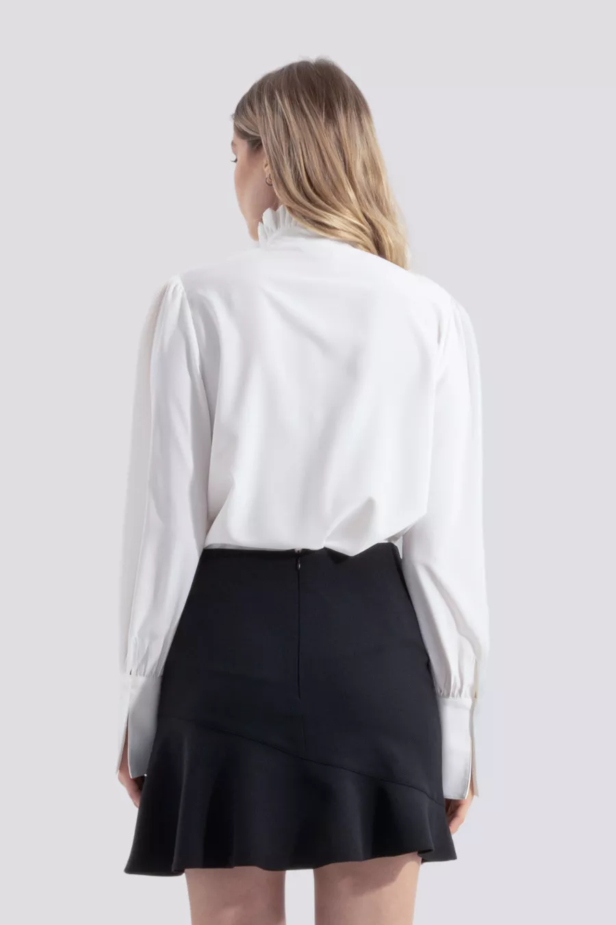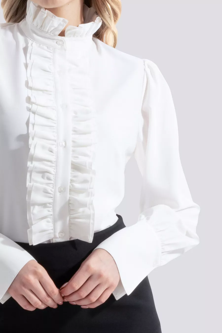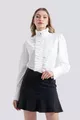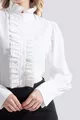 Juliet | Camicia di design con collo alla coreana, polsini, maniche lunghe, colletto e patta con volant - Bianco