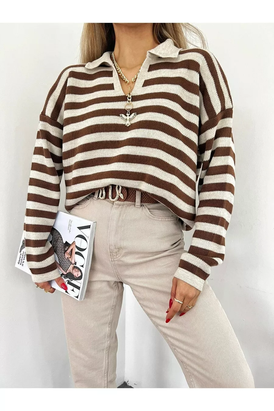 Maglione a righe donna con collo polo marrone beige a maniche lunghe