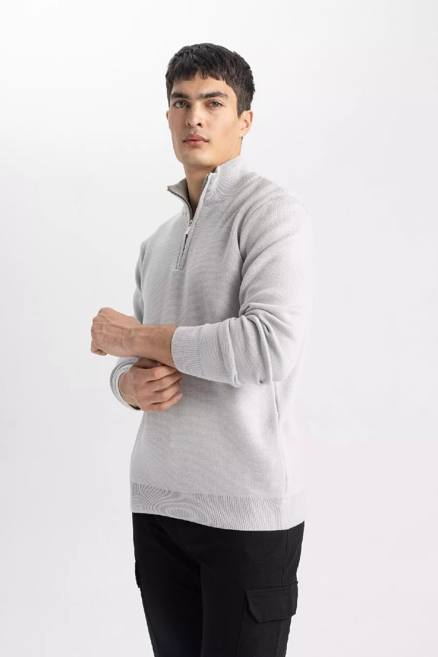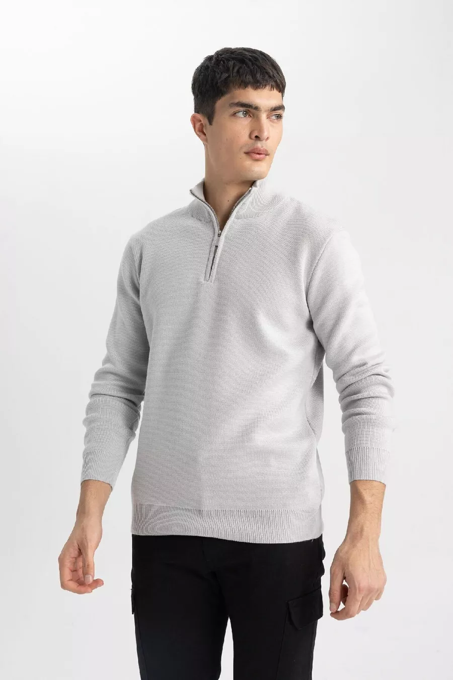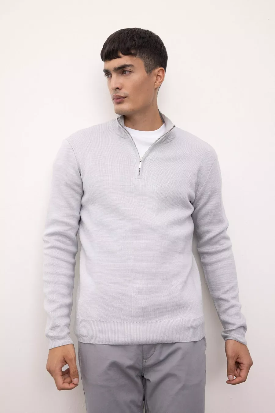 Maglione basic grigio a maglia liscia, fit standard, taglio normale, collo alto con zip au