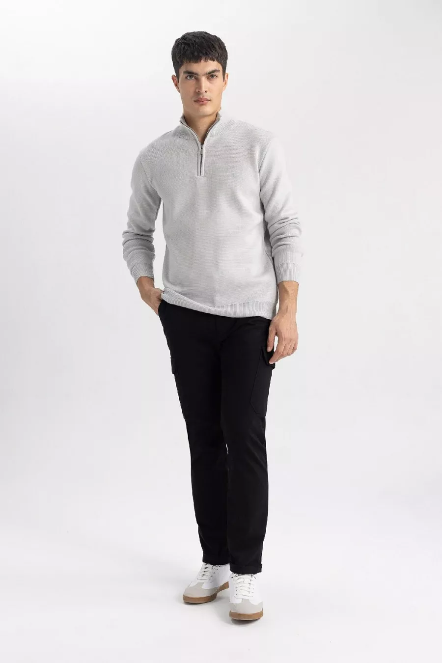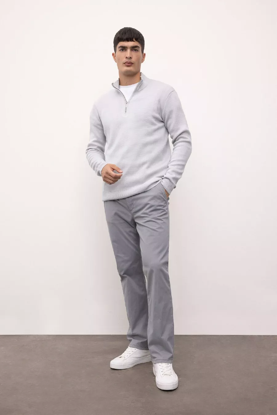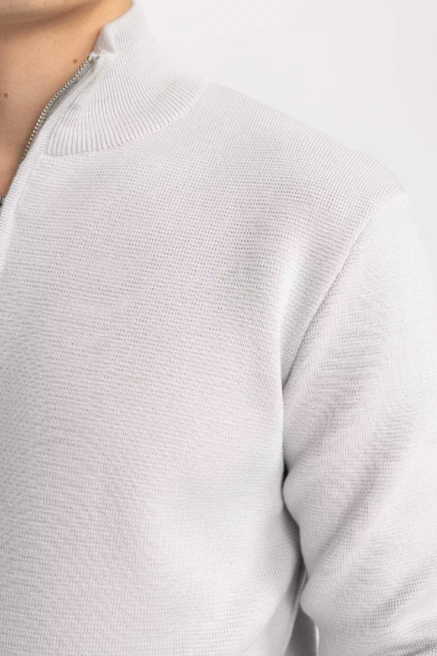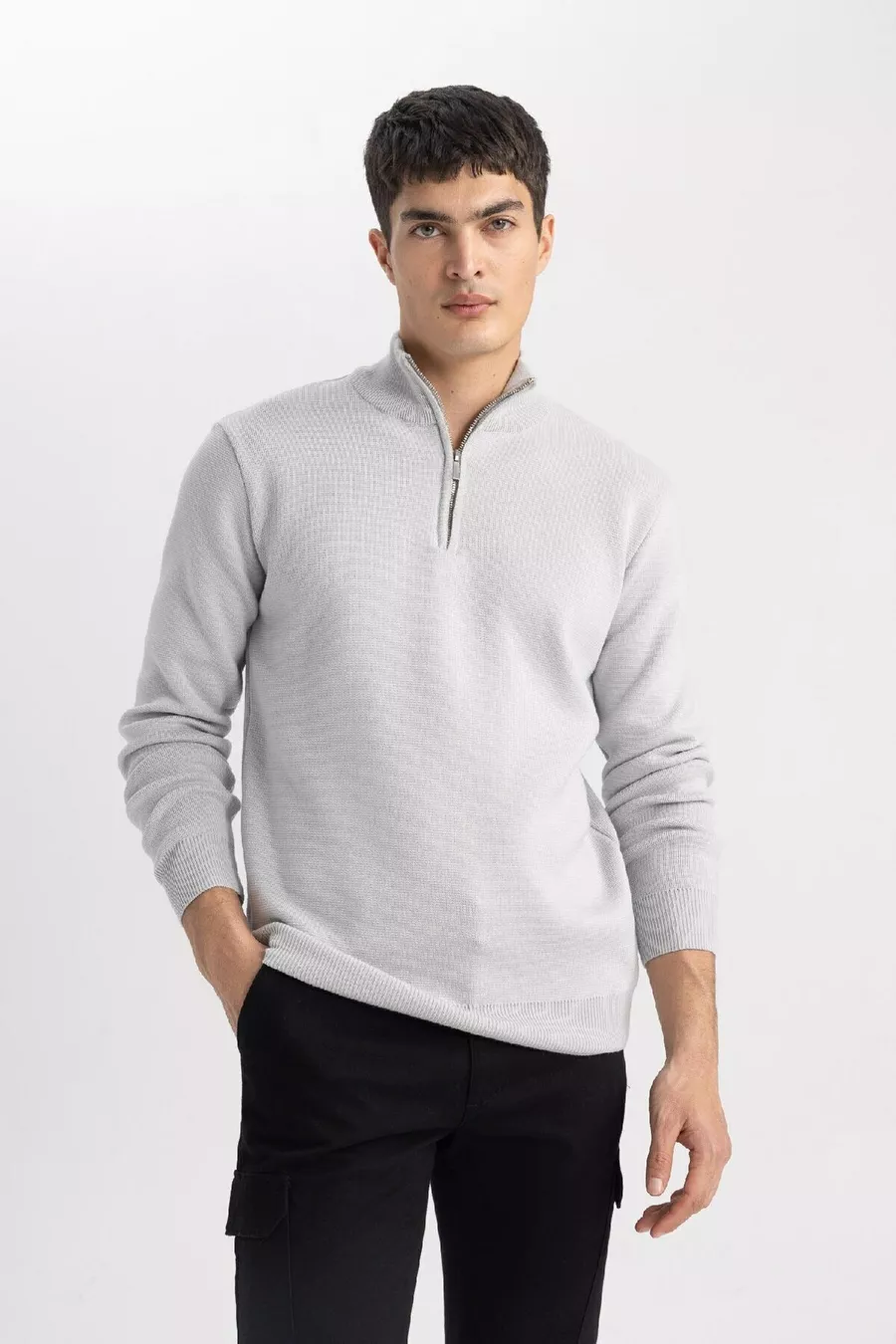 Maglione basic grigio a maglia liscia, fit standard, taglio normale, collo alto con zip au