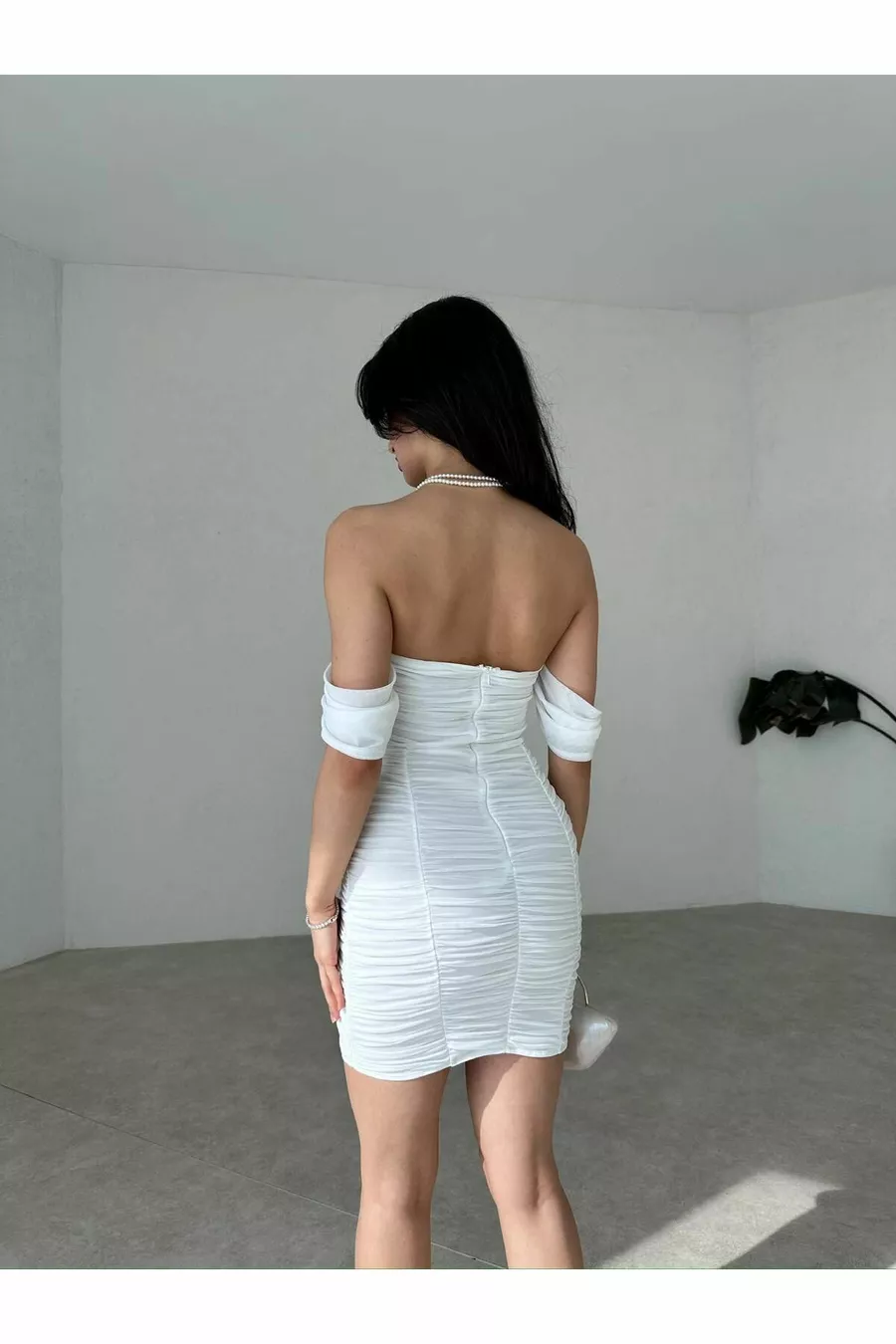 Mini abito da sera senza spalline bianco imbottito drappeggiato con spalla scesa - Abito da laurea