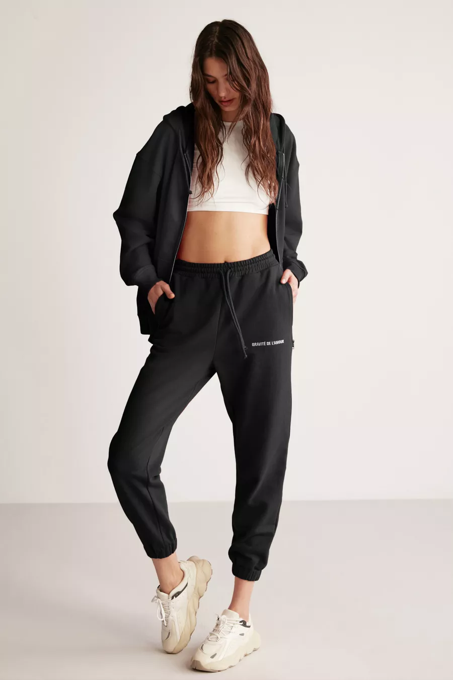 Pantaloni da jogging neri in cotone biologico a gamba stretta e vestibilità rilassata con ricamo da donna CARROLINE