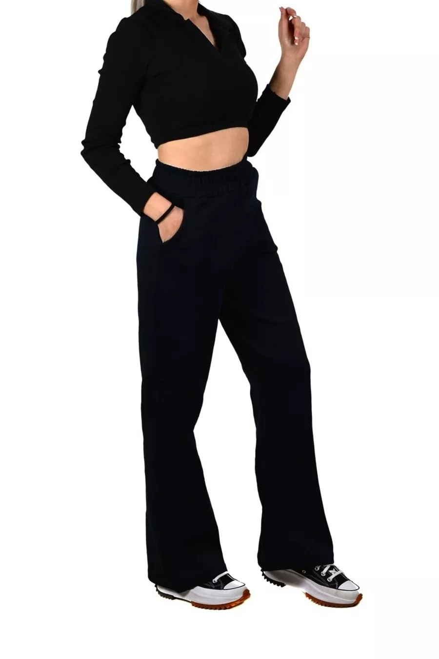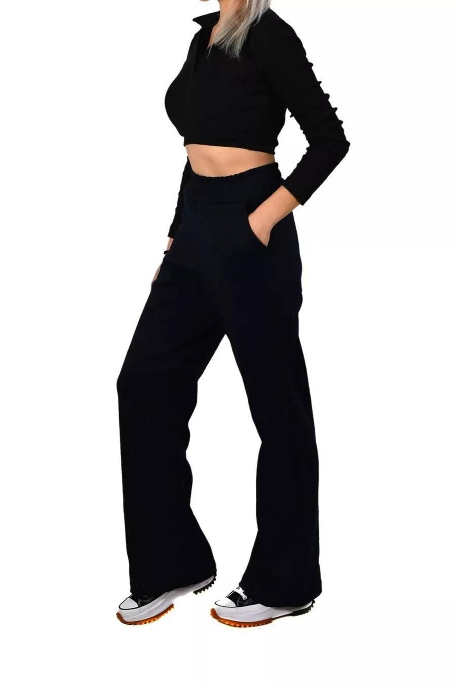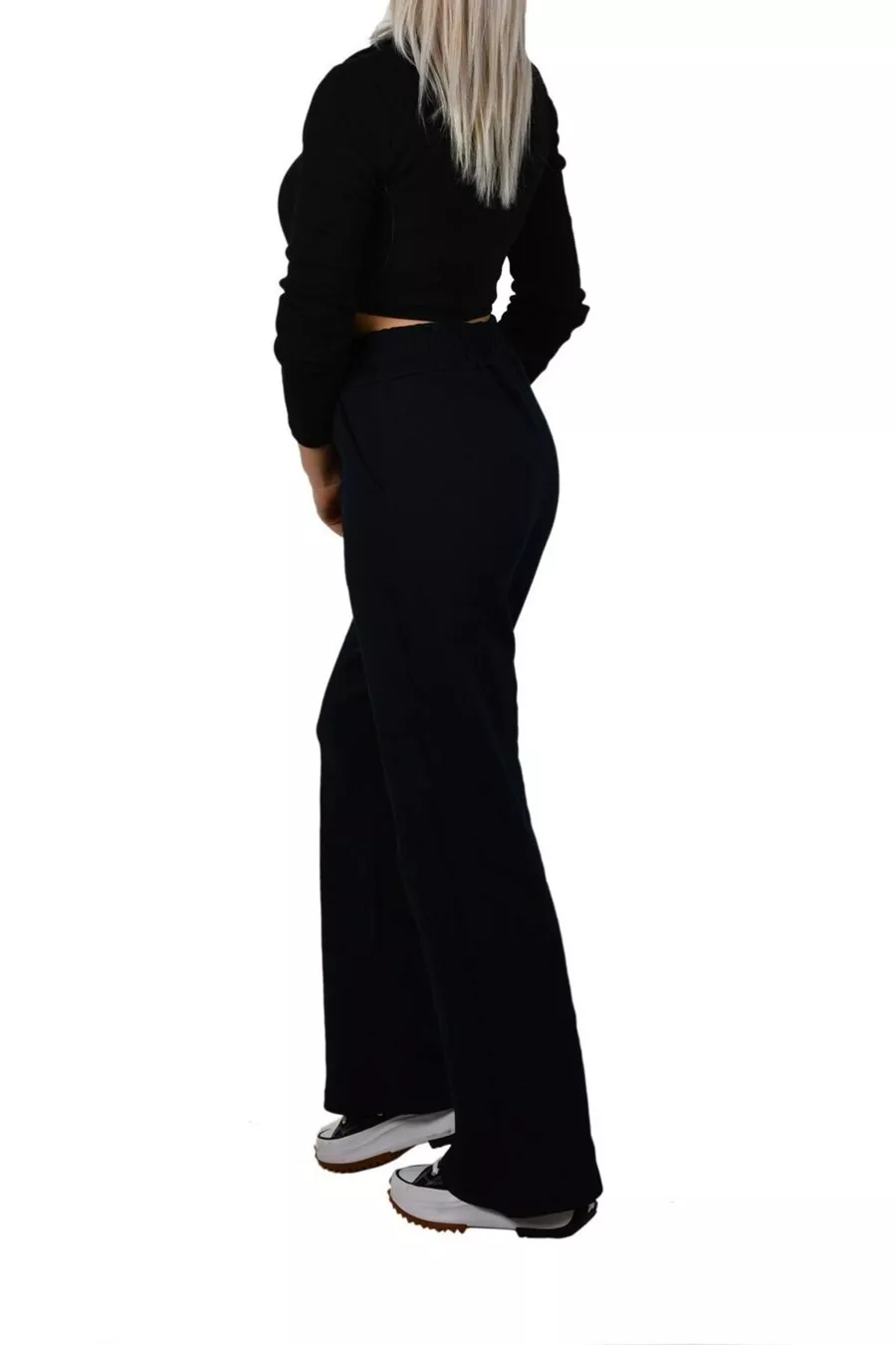 Pantaloni da tuta da donna blu scuro a vita alta con gamba larga