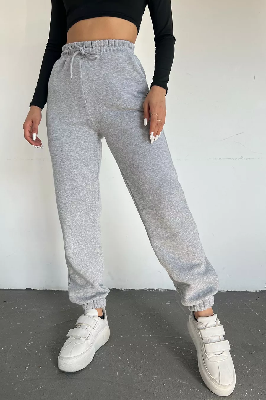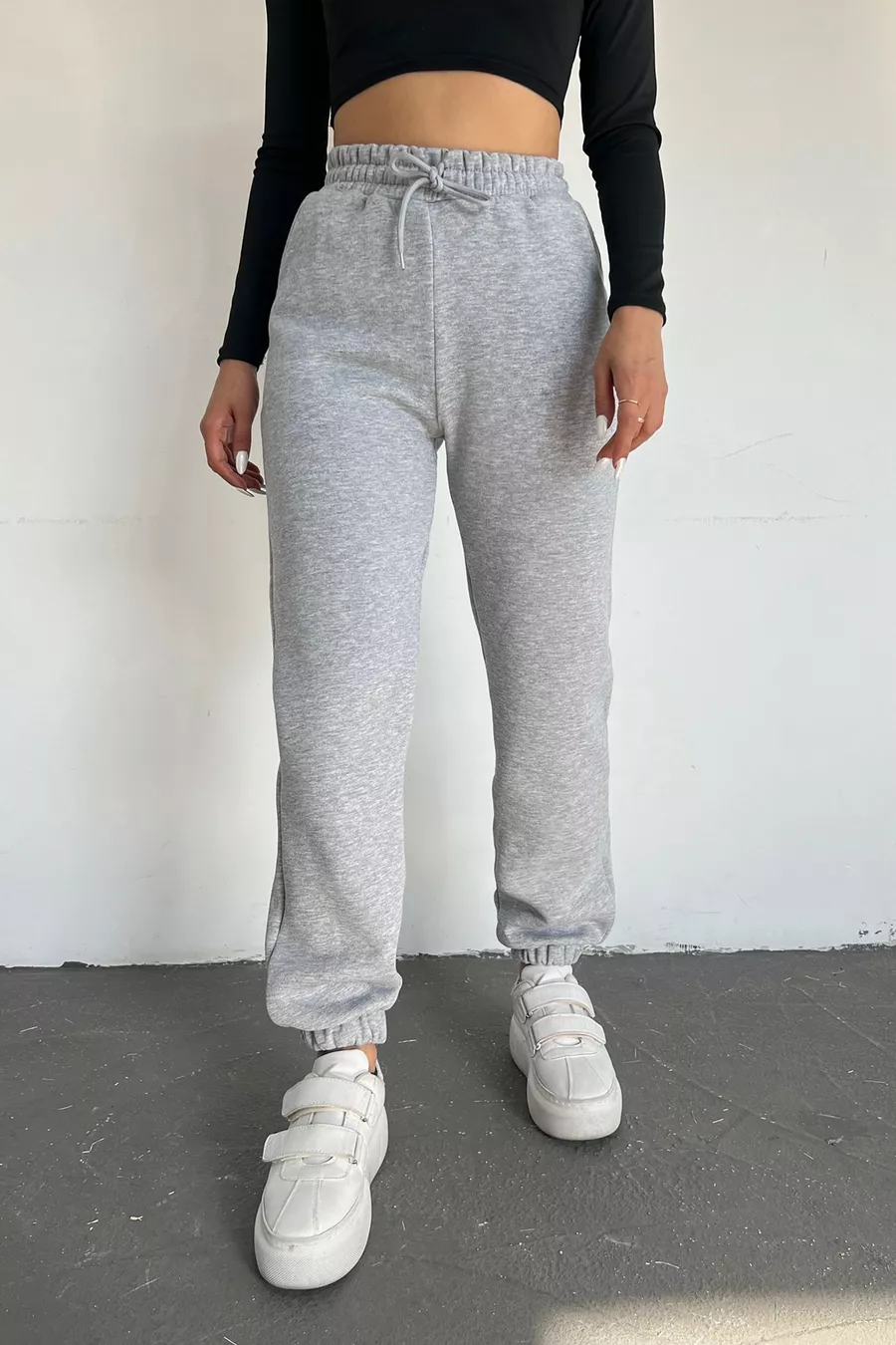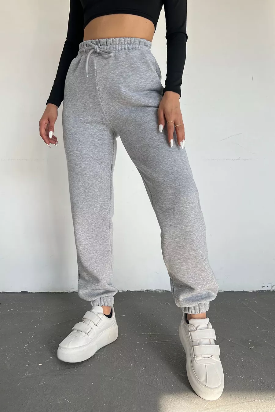 Pantaloni della tuta da donna grigi invernali, spessi, foderati in pile, vita alta, fondo gamba con elastico, jogger basic