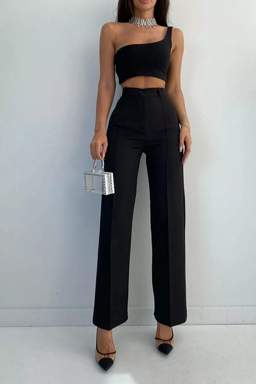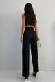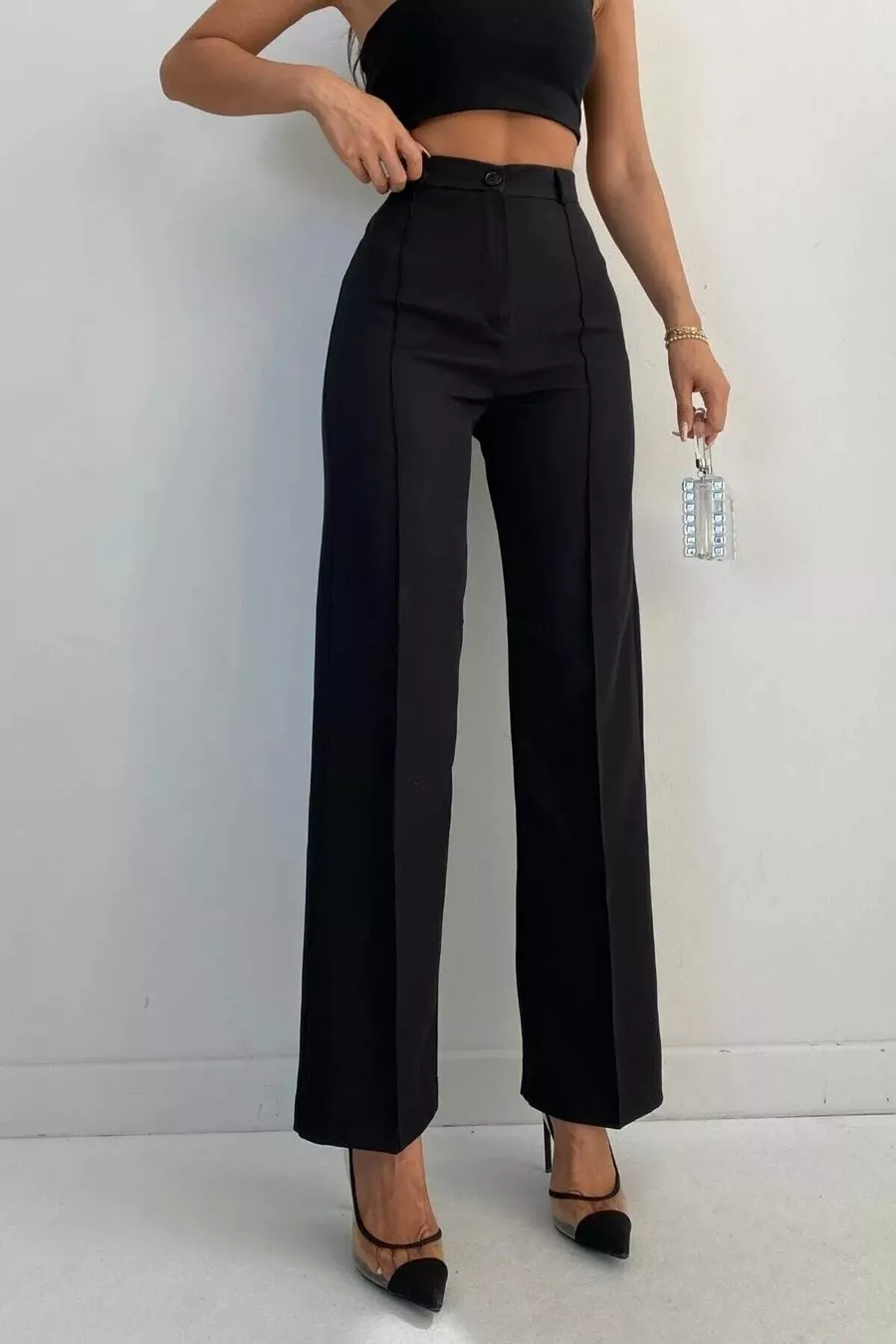 Pantaloni Palazzo da donna neri a vita alta con cuciture a coste modellanti