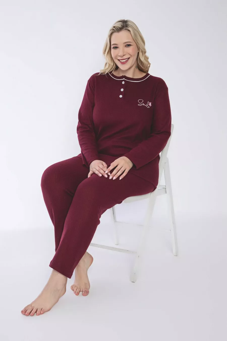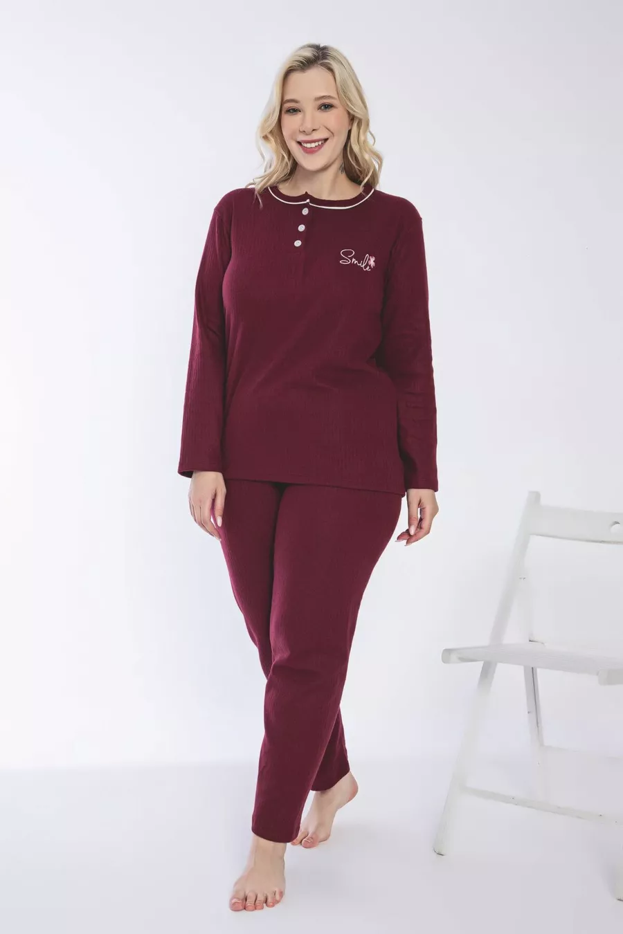 Pigiama da donna invernale bordeaux taglia grande con collo abbottonato e maniche lunghe in interlock