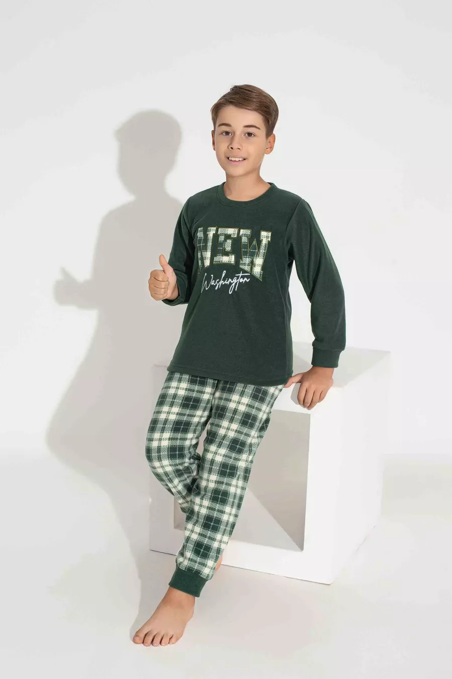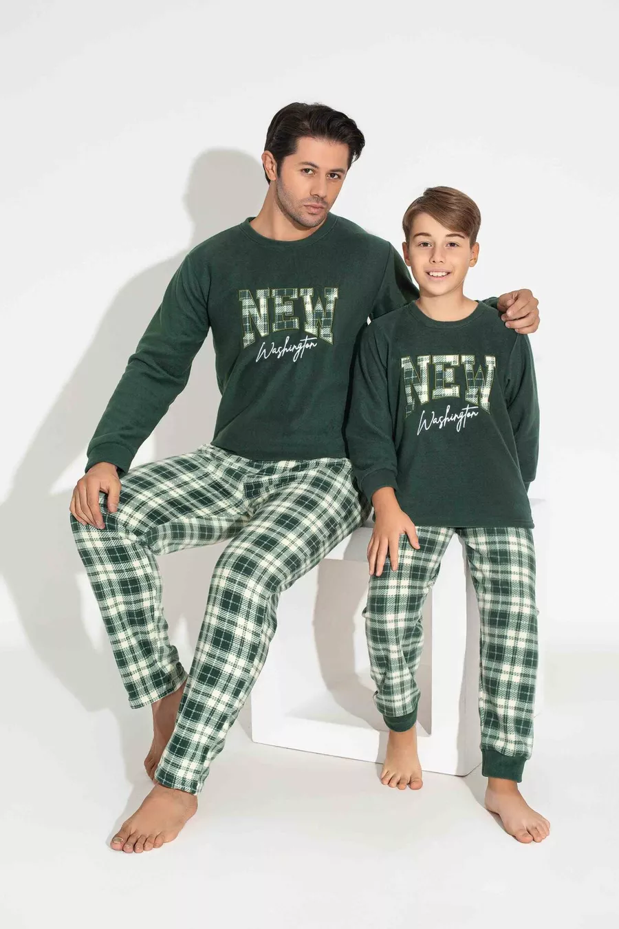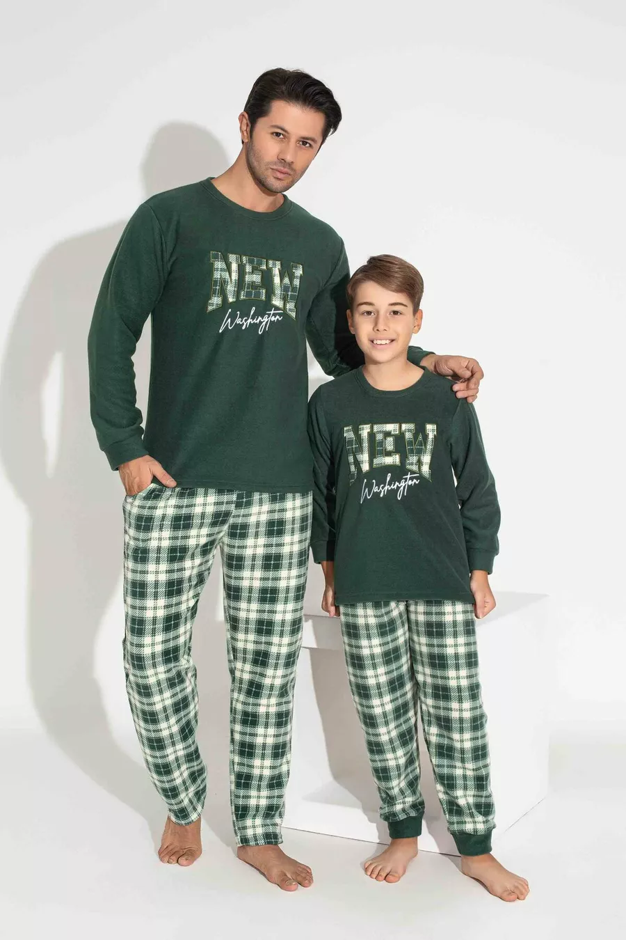 Pigiama da uomo padre-figlio in pile, a maniche lunghe, con motivo a quadri e plaid kaki, caldo per l'inverno