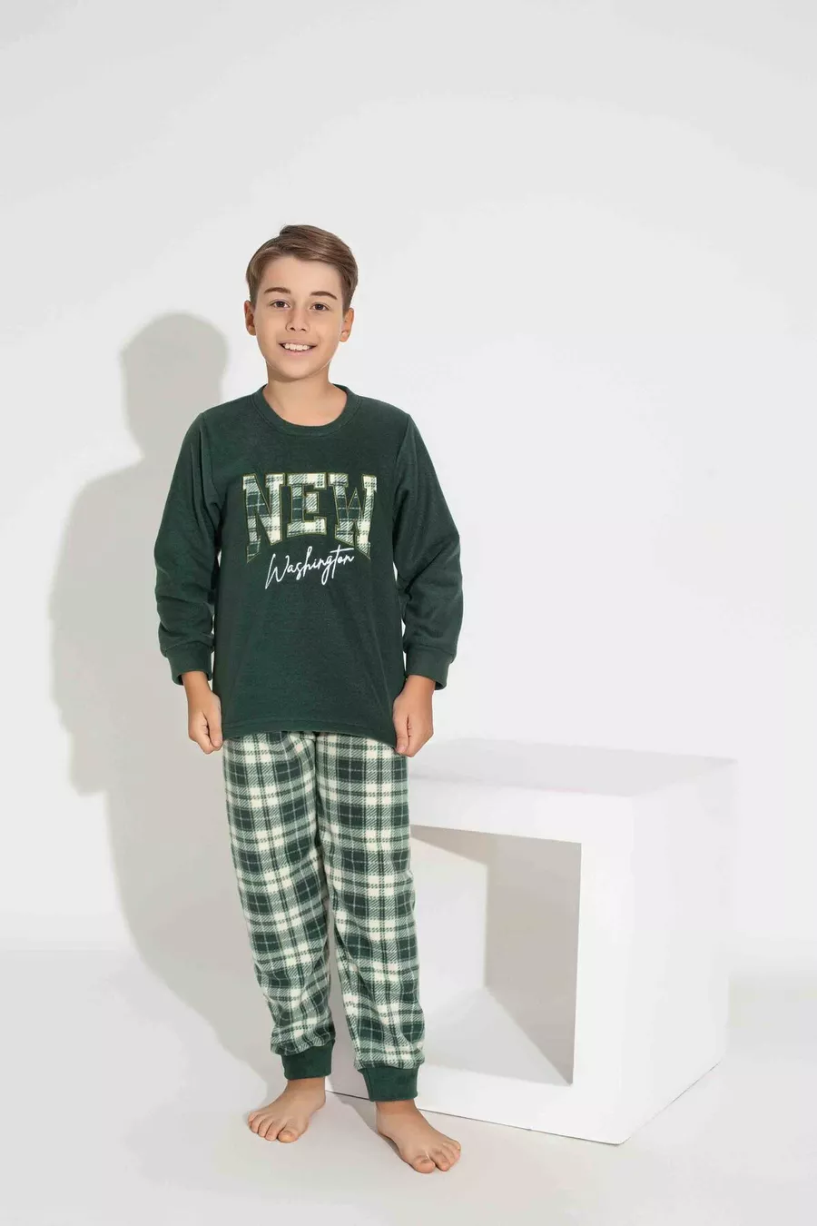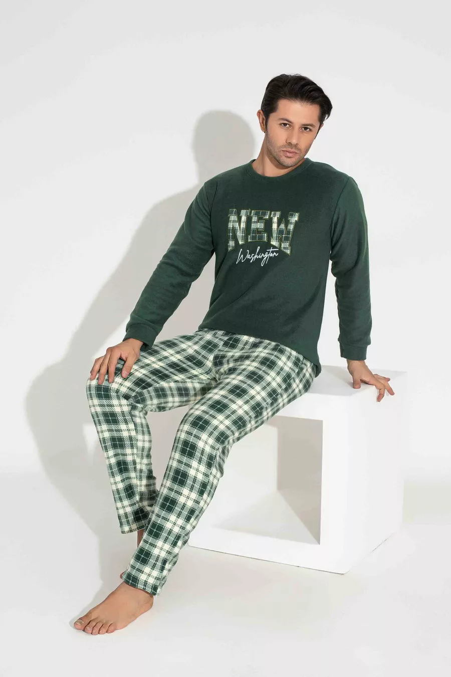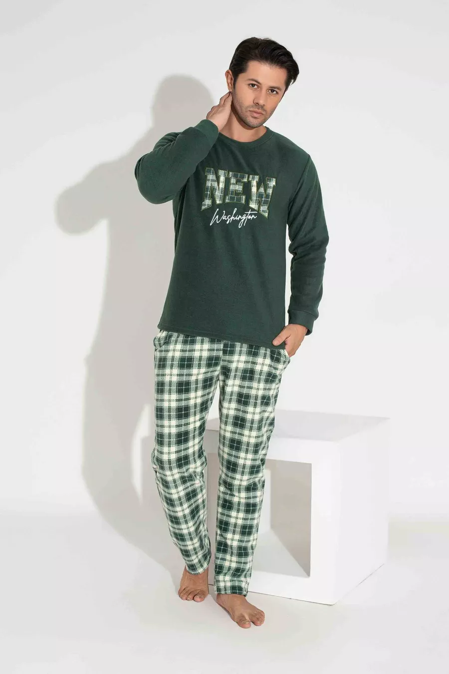 Pigiama da uomo padre-figlio in pile, a maniche lunghe, con motivo a quadri e plaid kaki, caldo per l'inverno