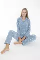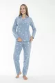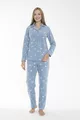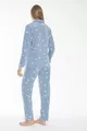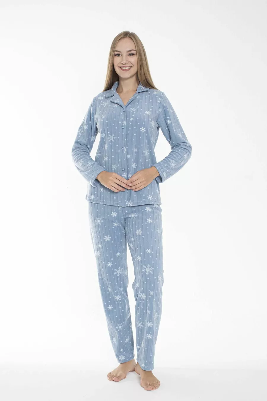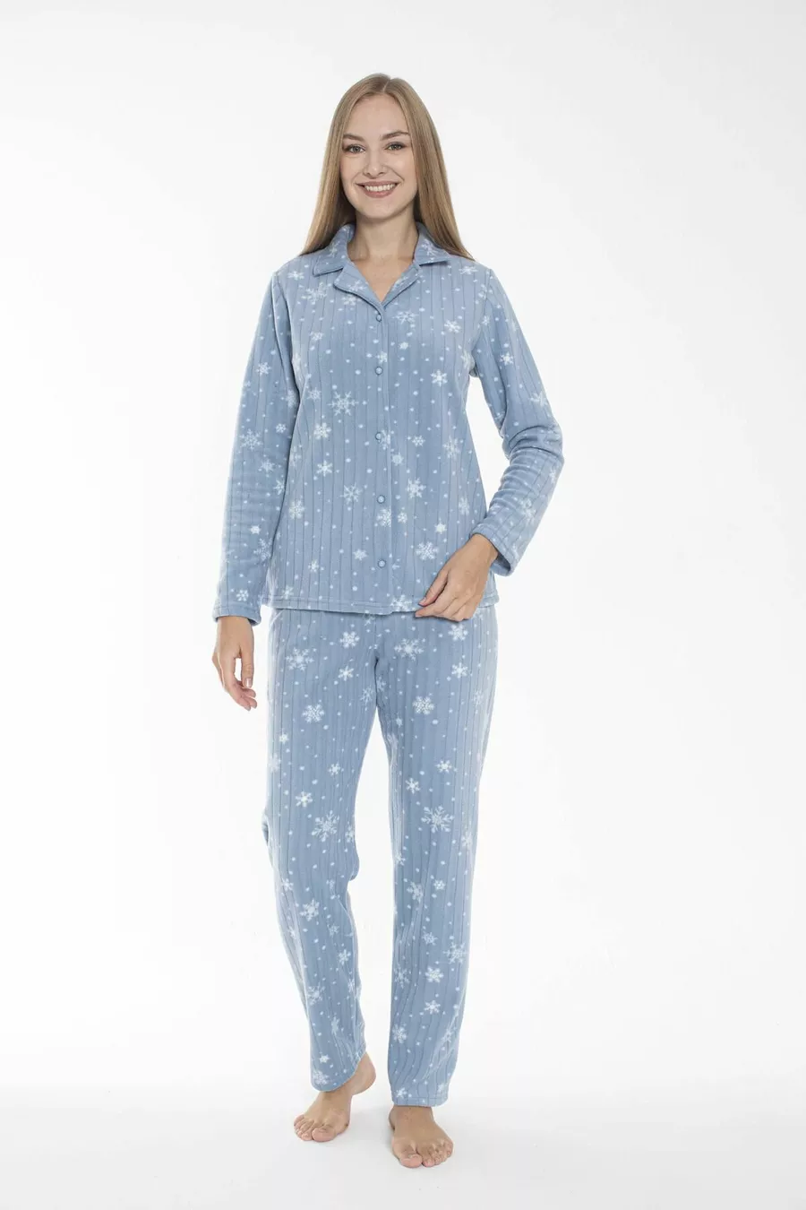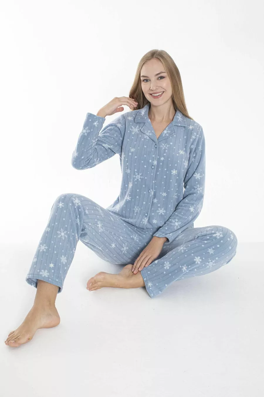 Pigiama da donna in pile a coste con bottoni frontali e motivo di neve invernale, blu