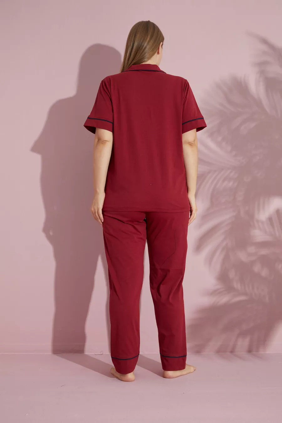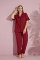 Pigiama da donna taglia grande bordeaux a maniche corte in cotone con bottoni sul davanti e bordino