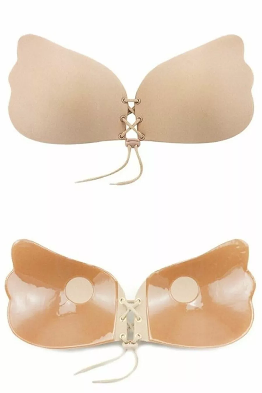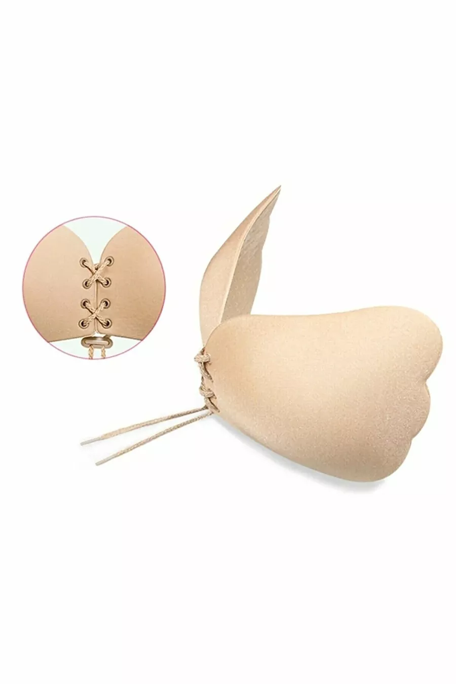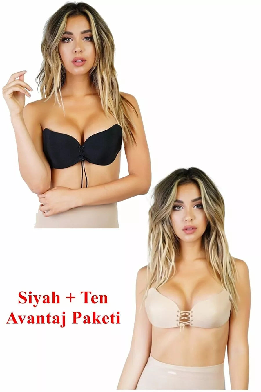 Reggiseno magico adesivo a doppio strato senza spalline con scollo frontale e cordino, effetto volumizzante, colore nude-nero